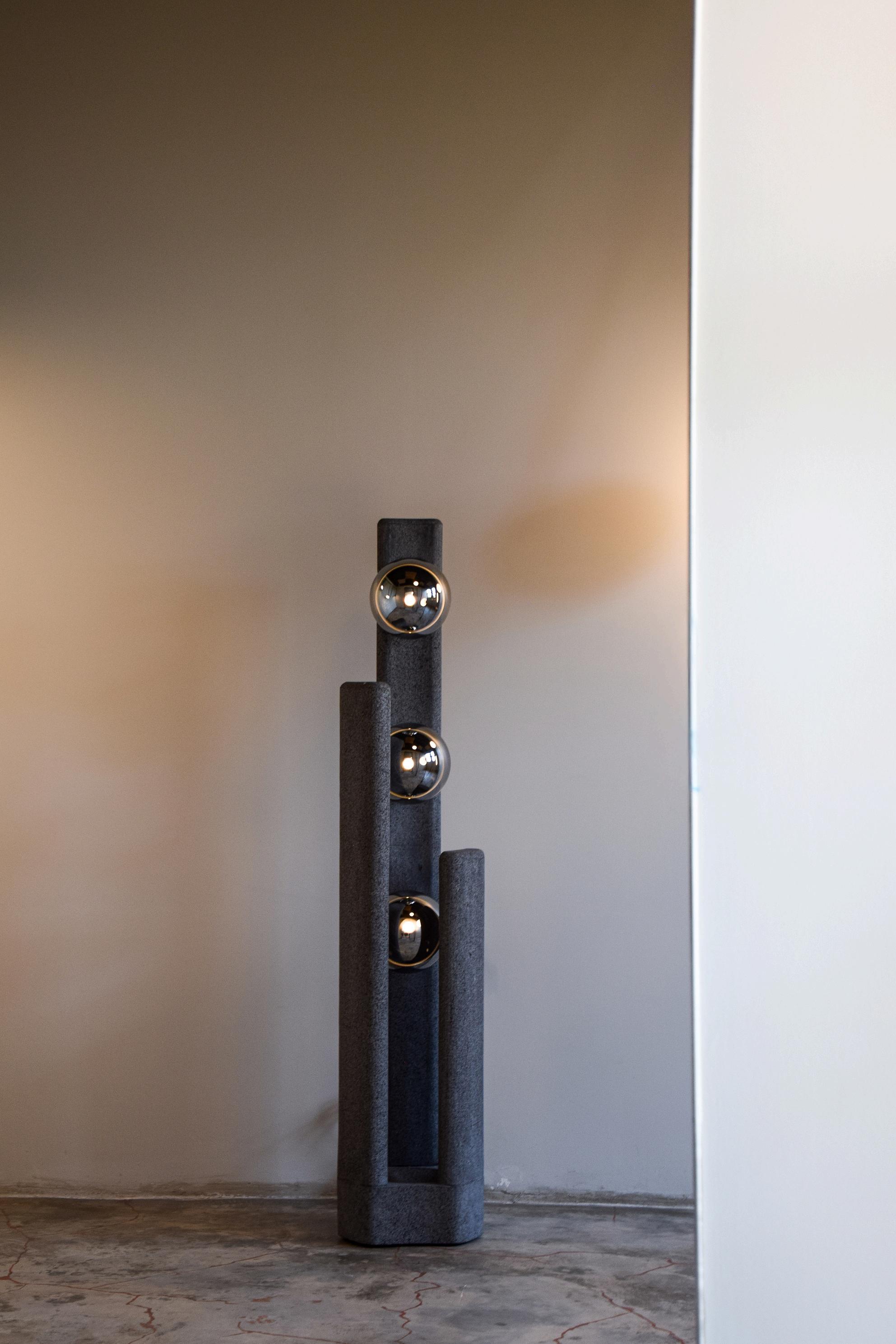 Noor, 2025, luminaria, recinto volcánico tallado a mano, con vidrio soplado, 22 x 22 x 140 cm, esferas de 5'''.