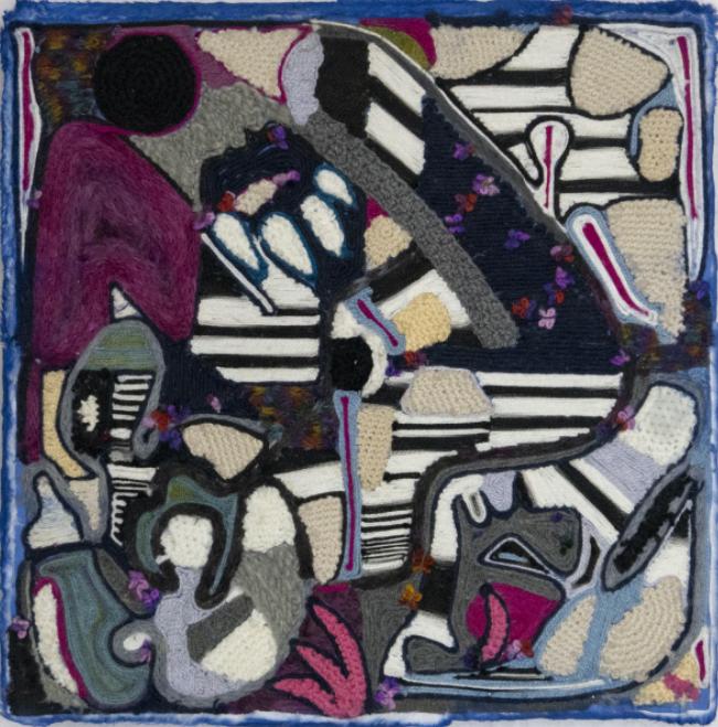 Spark in QuickSand, 2025, collage textil (estambre de algodón sobre foam), 60 x 60 cm.