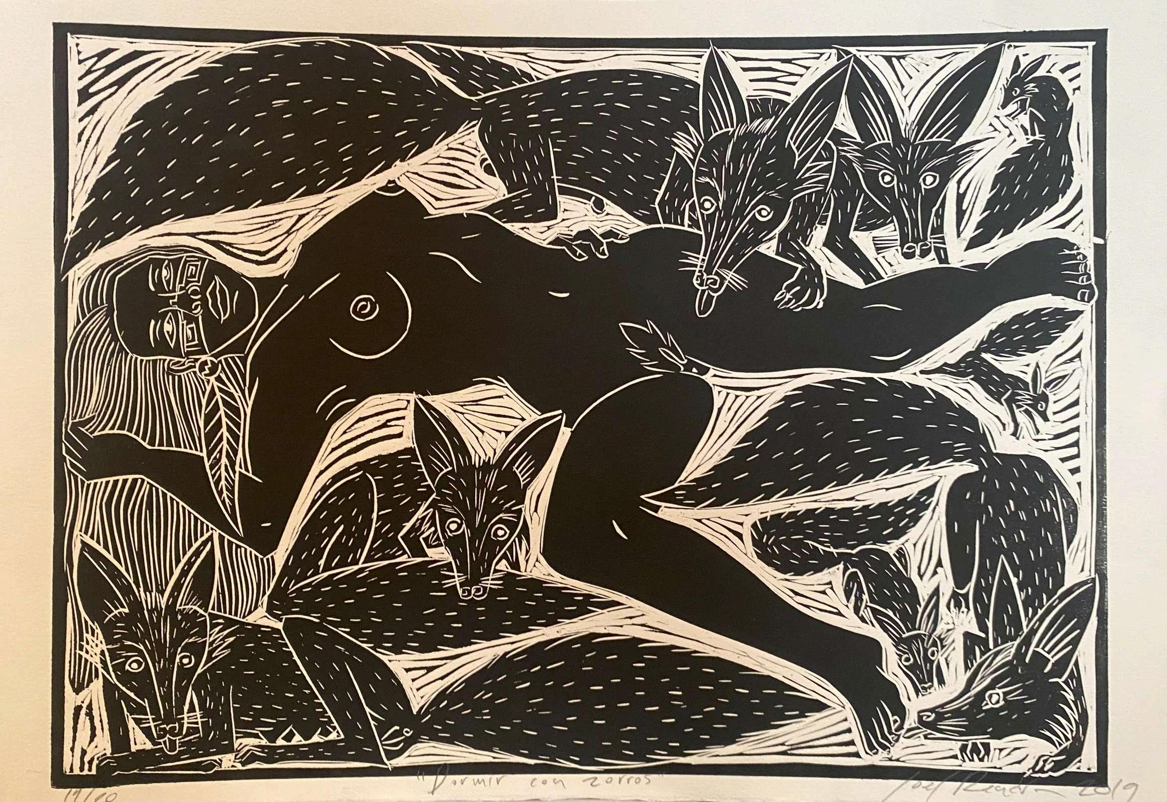 Joel Rendón Dormir con Zorros 2019 grabado en linóleo