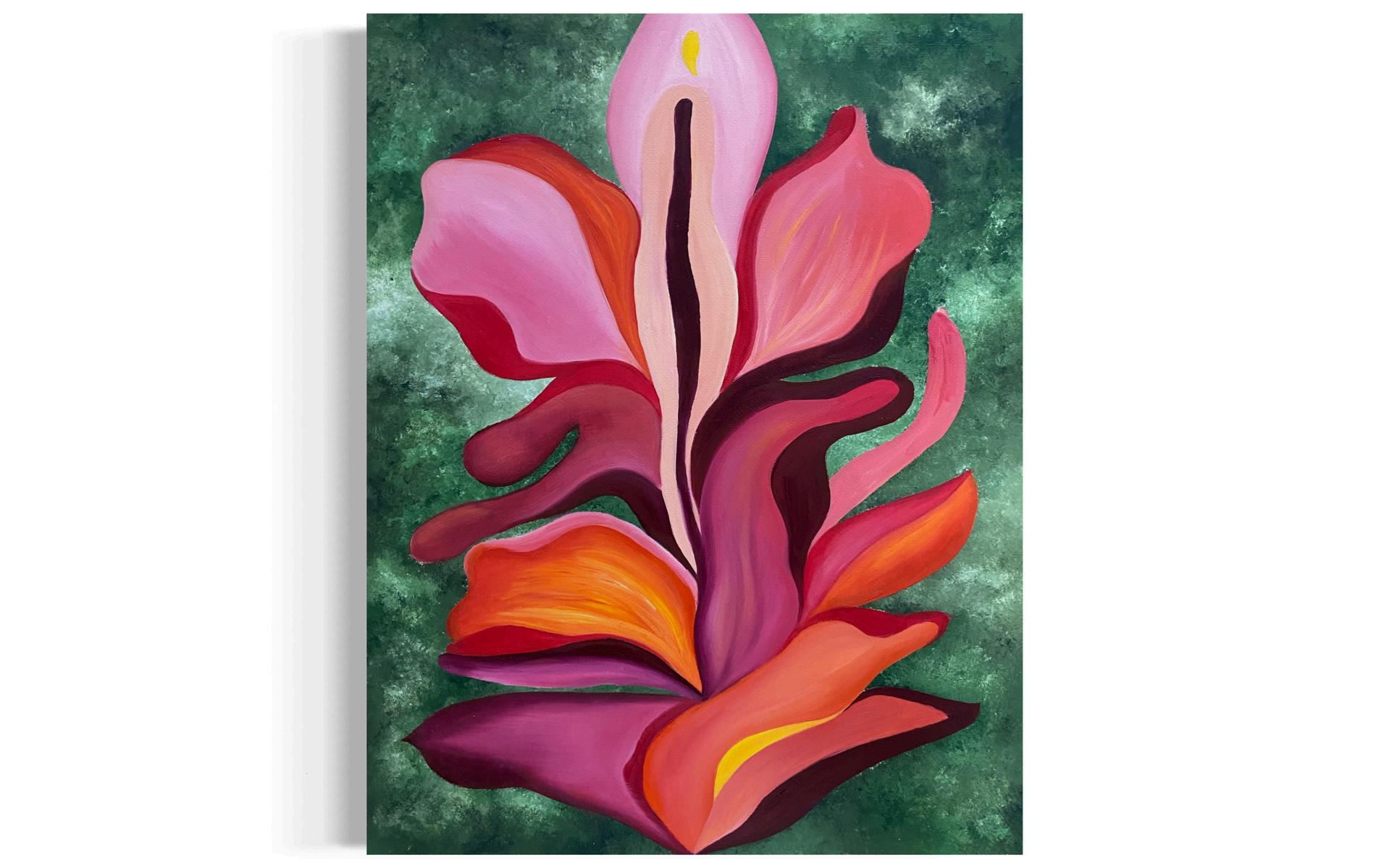 Sebastián Guillerm, Contemplación Espectral en Luna Roja, 2024. Óleo y flor sobre tela, 48 × 68 cm.