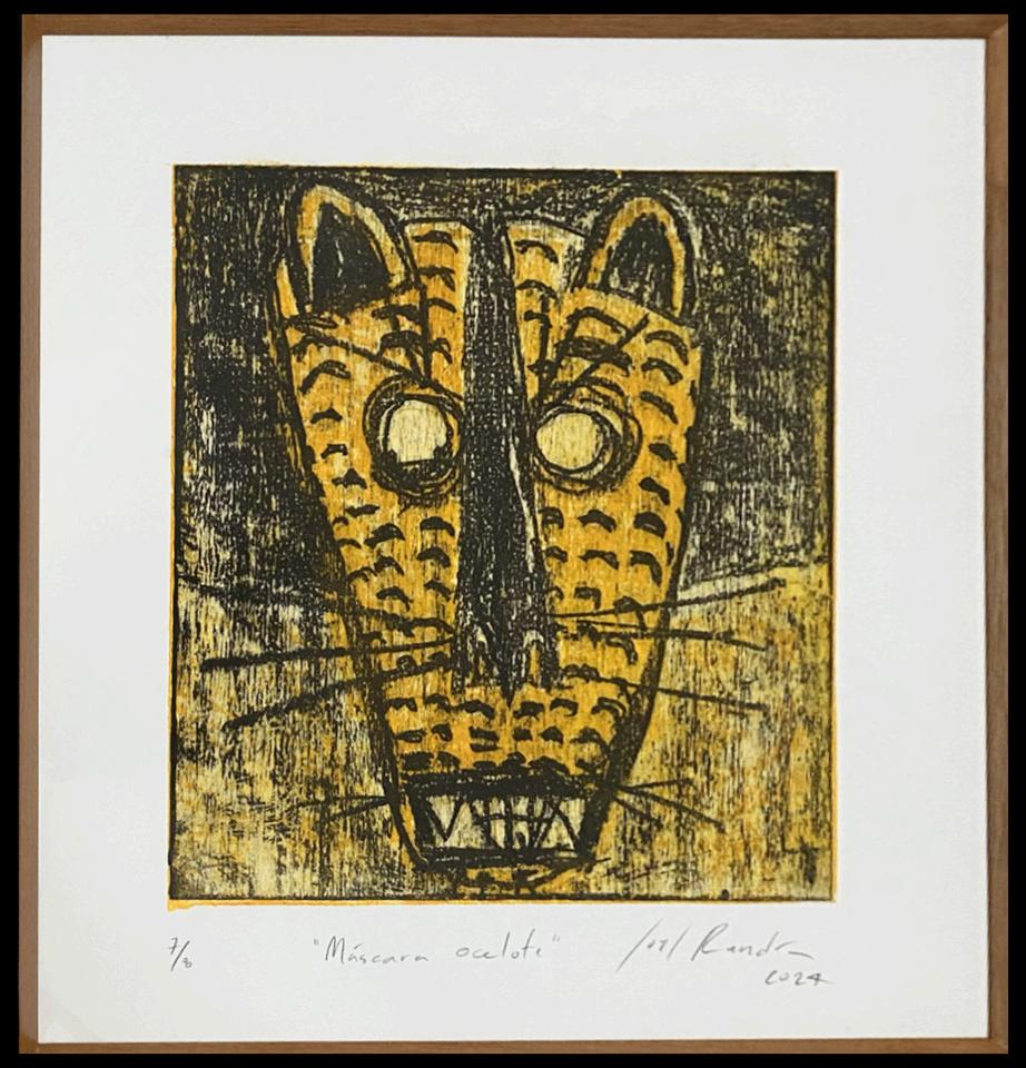 Joel Rendón, Máscara Ocelote, 2024. Litografía en madera (mokulito) a dos placas, 53 x 53.5 cm.