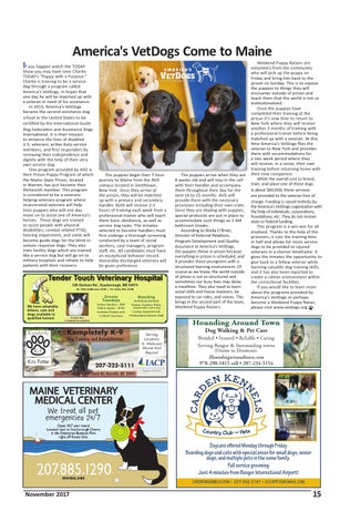 America's VetDogs Come to Maine If you happen watch the TODAY Show you may have seen Charlie, TODAY’s “Puppy with a Purpose.” Charlie is training to be a service dog through a program called America’s VetDogs, in hopes that one day he will be matched up with a veteran in need of his assistance. In 2013, America's VetDogs became the second assistance dog school in the United States to be cer fied by the Interna onal Guide Dog Federa on and Assistance Dogs Interna onal. It is their mission to enhance the lives of disabled U.S. veterans, ac ve duty service members, and first responders by renewing their independence and dignity with the help of their very own service dog. One program provided by AVD is their Prison Puppy Program of which the Maine State Prison, located in Warren, has just become their thirteenth member. This program is considered to be a veterans helping veterans program where incarcerated veterans will help train puppies who will one day move on to assist one of America’s heroes. These dogs are trained to assist people with physical disabili es, combat related PTSD, hearing impairment, and some will become guide dogs for the blind or seizure response dogs. They also train facility dogs which are trained like a service dog but will go on to military hospitals and rehabs to help pa ents with their recovery.