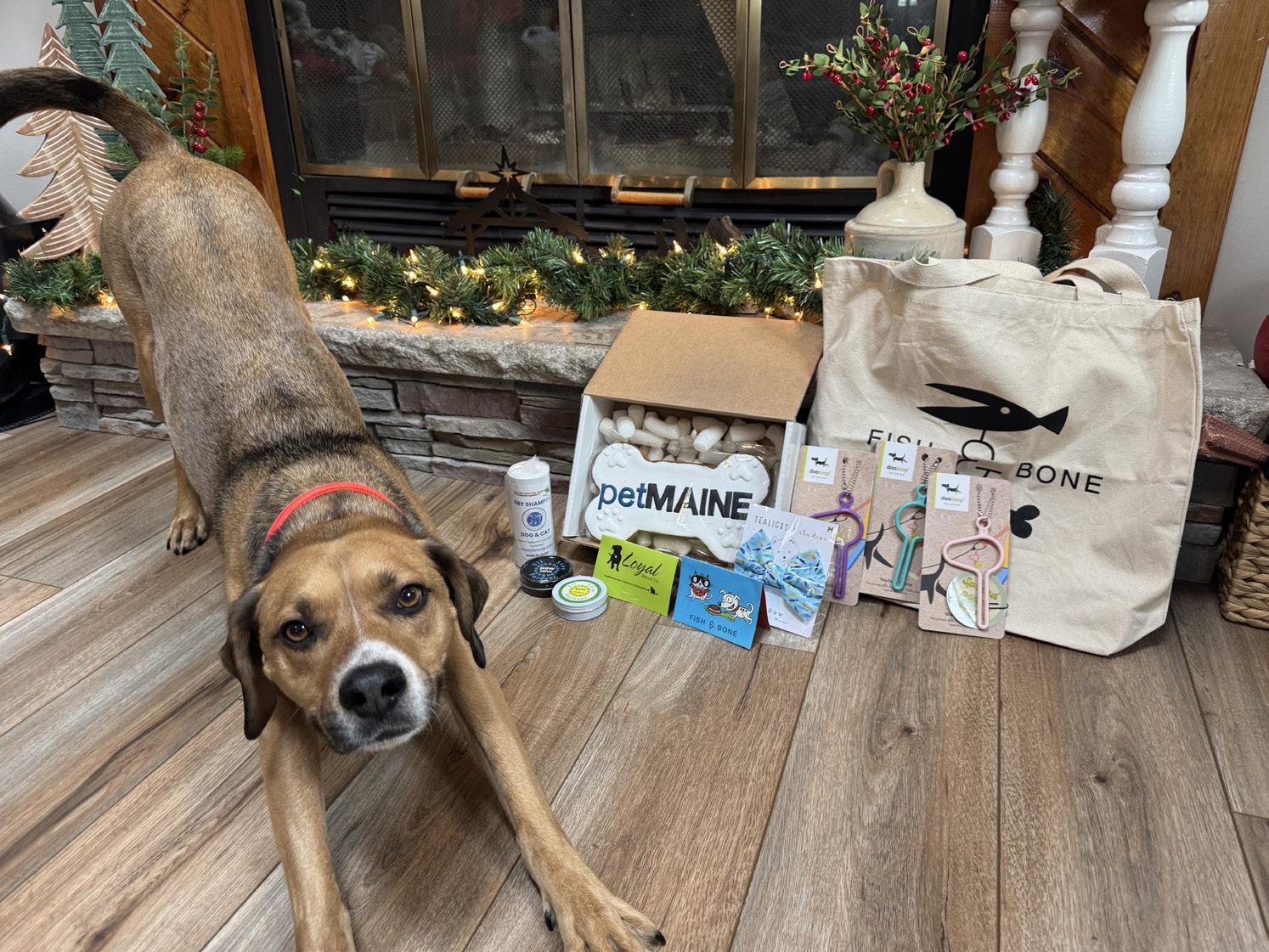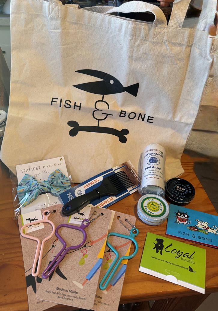 his prize: a gift basket full of goodies generously provided by our contest sponsors. The prize includes a custommade cookie from Mountain Dog Cookie Co., a gift certificate to Loyal Biscuit, a gift certificate and tote bag from Fish and Bone, dooloops, a CoatHook grooming tool, products from Sit. Stay. Forever., and a bowtie from Tealight Studios.