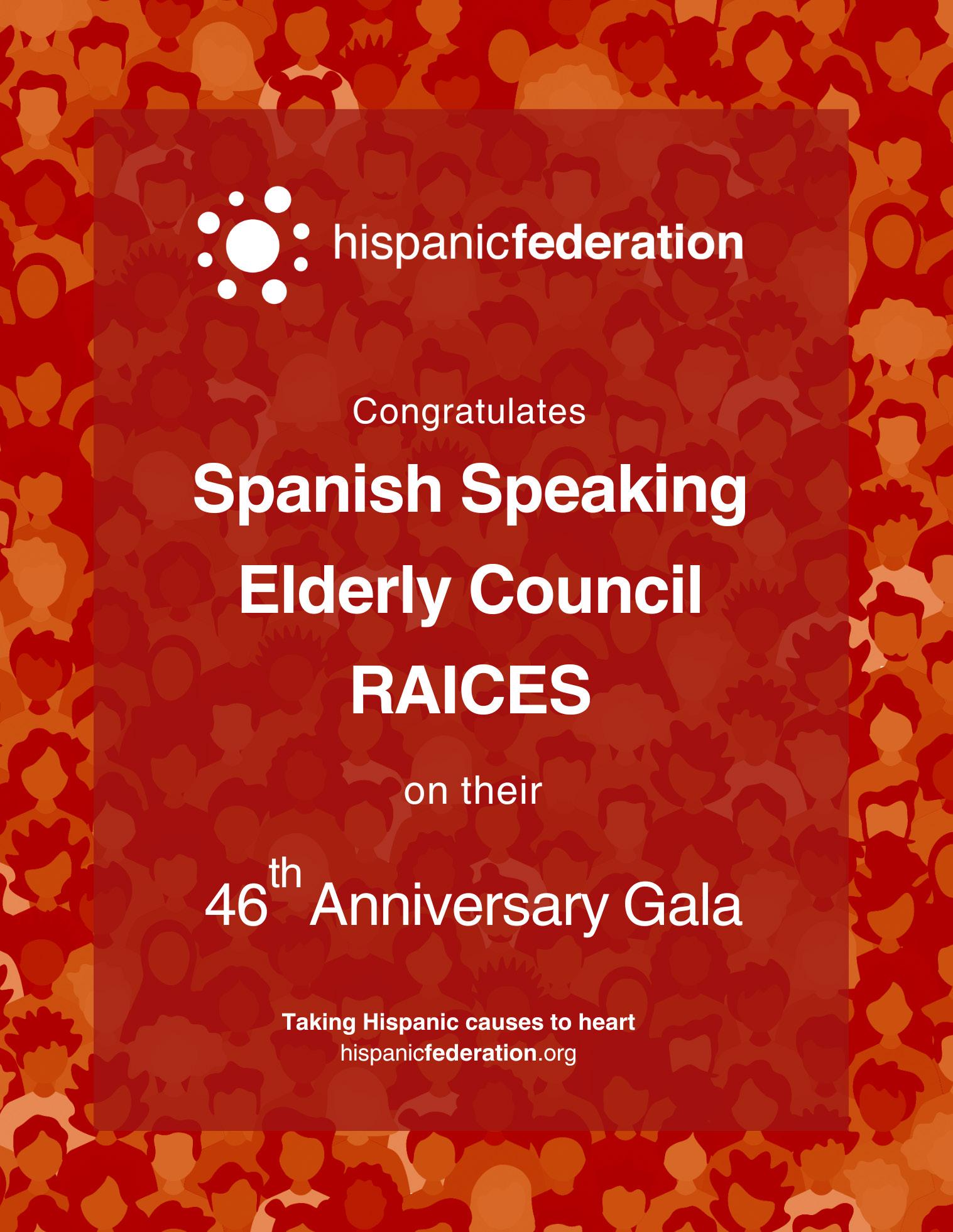 I am delighted to extend personal greetings to the Spanish Speaking Elderly Council RAICES, this year’s honorees, and guests on this special occasion of its 46th Year Anniversary.