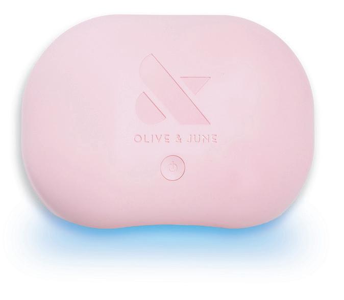 Speed dry a DIY gel mani with the nifty ve- nger LED lamp in Olive & June’s All-in-One At-Home Gel Manicure System, which makes removal speedier than ever, too: The kit comes with a peel-o base coat, no soaking required. ($65, oliveandjune.com)