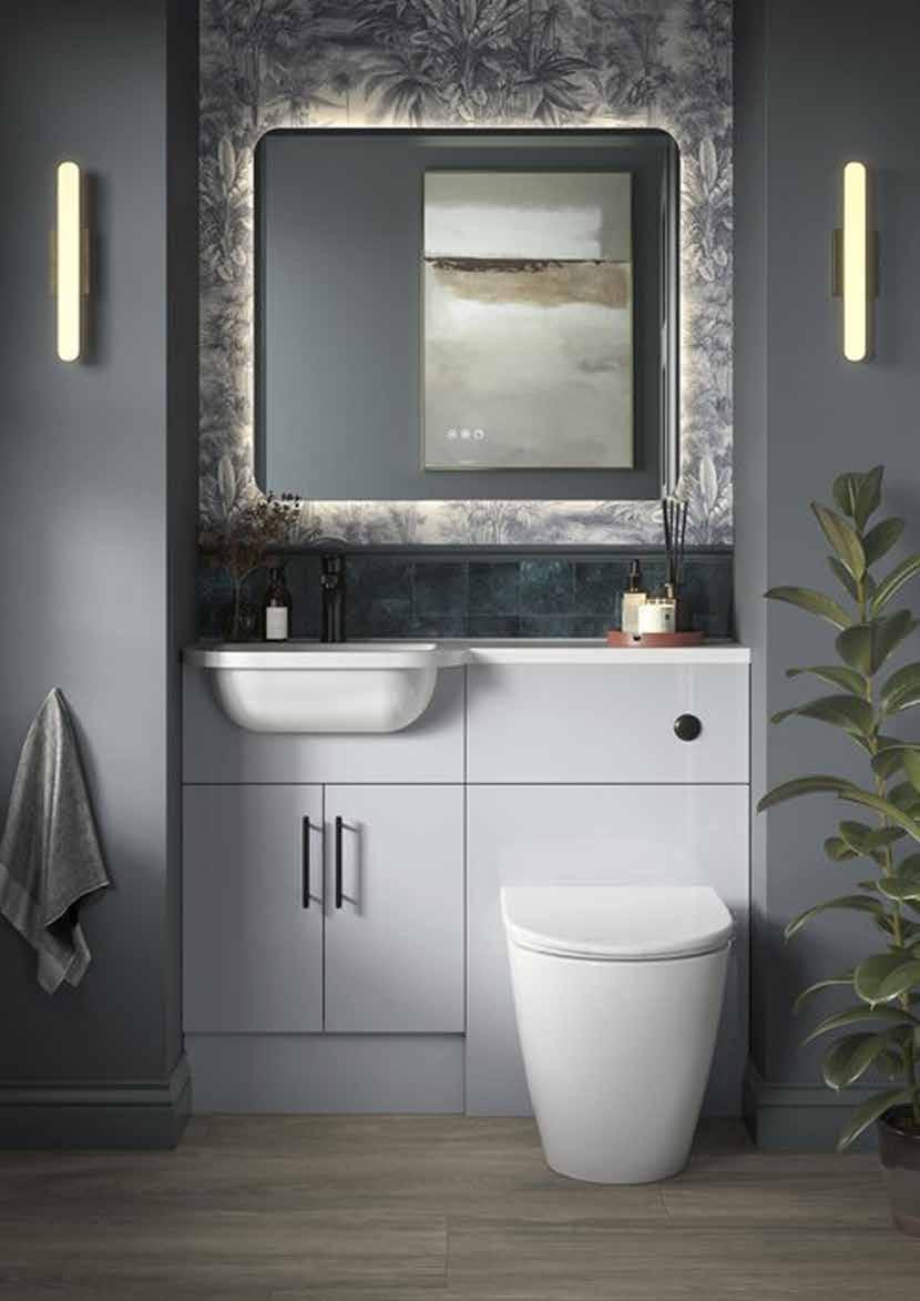 Veldeau fitted furniture kits include carcasses, end panels, plinths, a basin, a WC pan, a cistern, and a flush buttoneverything you need apart from the tap.