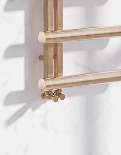 The Ballerina wall mounted in a brush brass offers the latest metallic finish as an update to this popular and very functional towel rail. This finish bridges both traditional and contemporary classic interior design. Simple matching valves and connection tubes with cover plates complete the look.