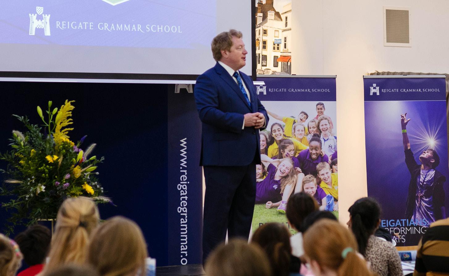 Surrounded by award winning pieces of art, Headmaster Shaun Fenton spoke with great passion about the history of RGS, the importance of being a Reigatian in the modern world and the opportunities to get involved with our work in the community. He then went on to introduce Adam Gosnold, a parent who has had three children pass through the doors of RGS (the last leaving in 2021).