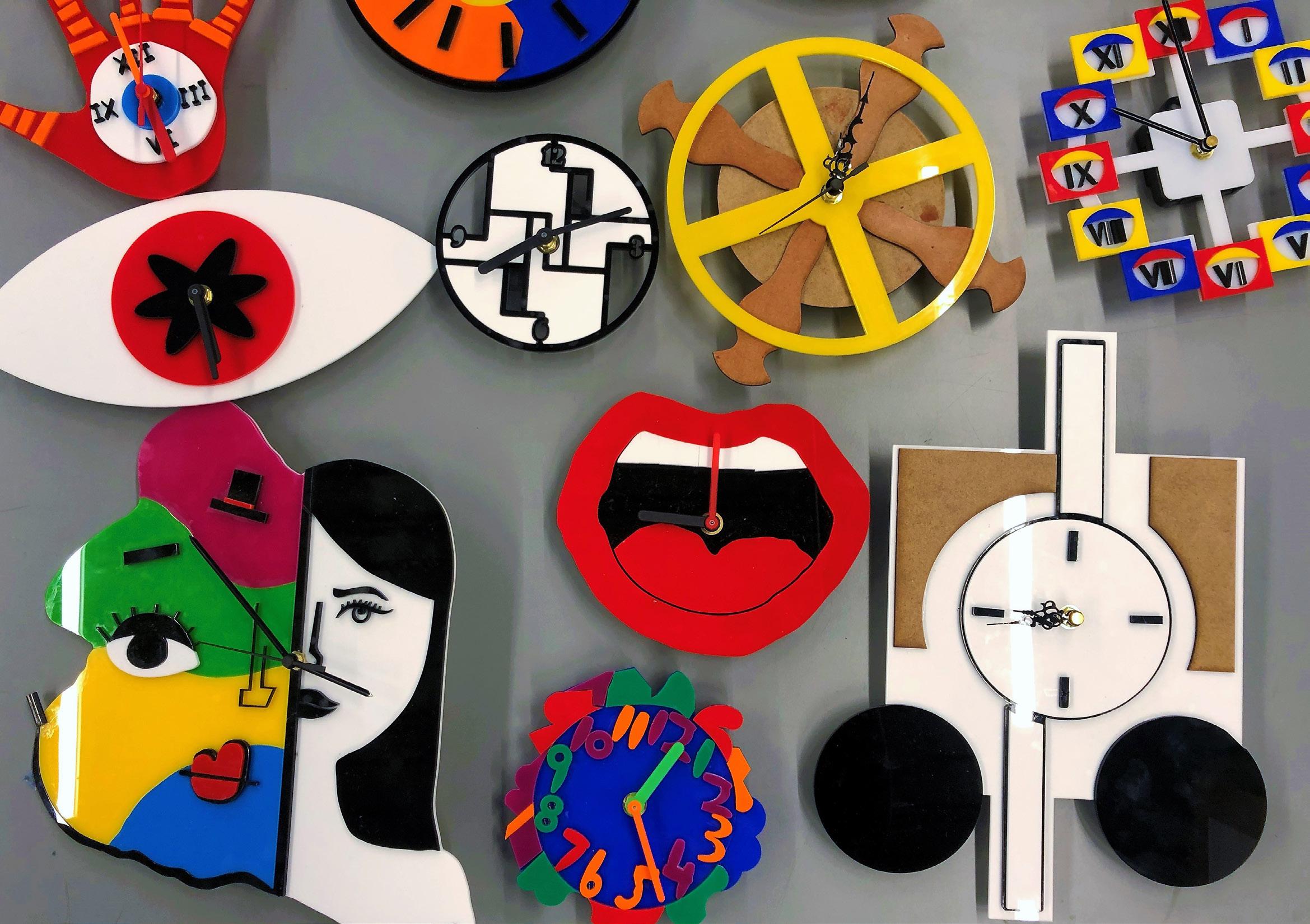 The clocks shown here are the practical outcomes of one of two projects in the Second Form D&T curriculum.