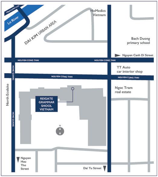 Reigate Grammar School Vietnam is situated in the south of the city in the district of Hoang Mai at 6-7 Dai Kim-Dinh Cong New Urban Area, Dai Kim Ward. Being south of the city centre means that there are fewer expatriate facilities in the area including housing, restaurants and shops but within 2 minutes walk, there is a supermarket, ATM machines, and local co ee shops and pavement food places. There is space behind the school to park motorbikes or bicycles, which is watched by a guard at all times.