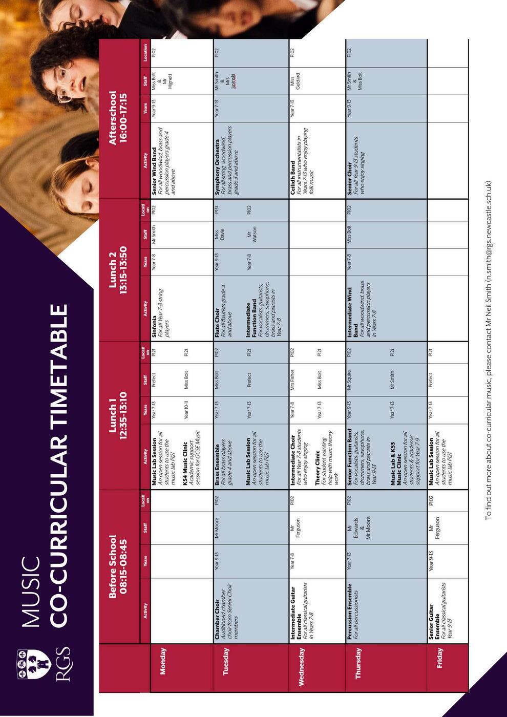 To find out more about the visiting music teachers and instruments on offer, please visit www rgs newcastle sch uk/current-families/performing-arts/visiting-music-teachers or contact Mr Neil Smith - N smith@rgs newcastle sch uk