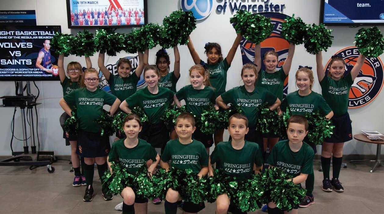 Pupils from RGS Springfield thrilled the audience at the NBL Worcester Wolves versus Myerscough Basketball Academy game. During the quarter-time break, the School’s cheerleading squad, made up of fifteen pupils from Years Four to Six, wowed the packed crowd with their Pom Cheer performance, displaying confidence and style.