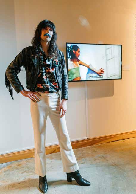 Zac Thompson in front of their video, You May Touch My Dust But Please Don't Write In It, 2019.