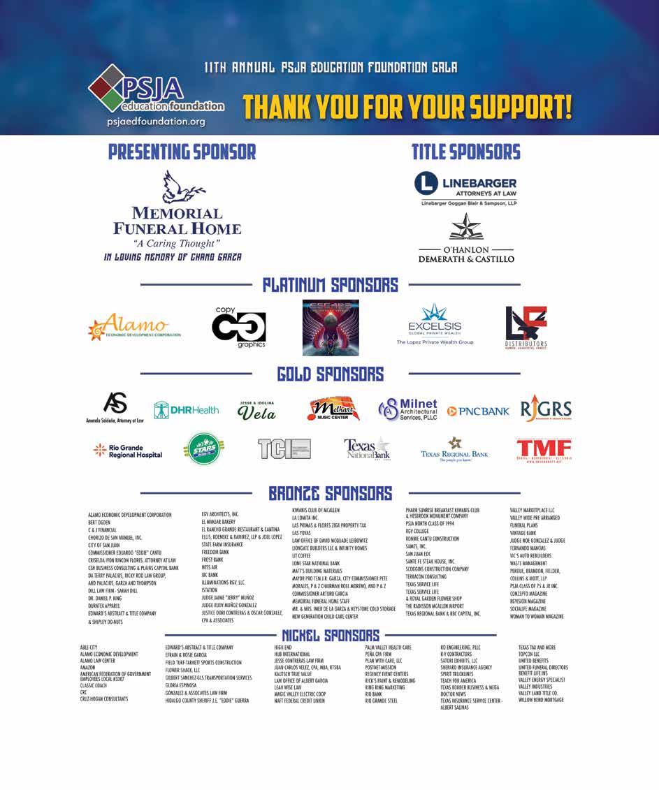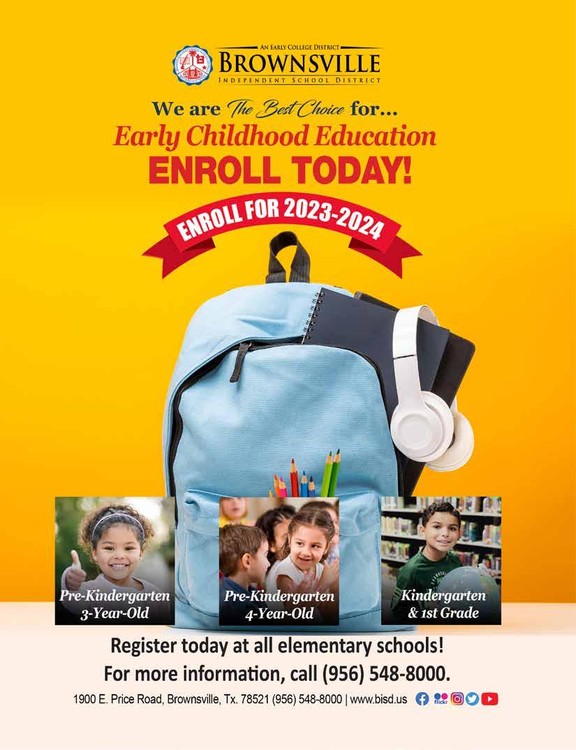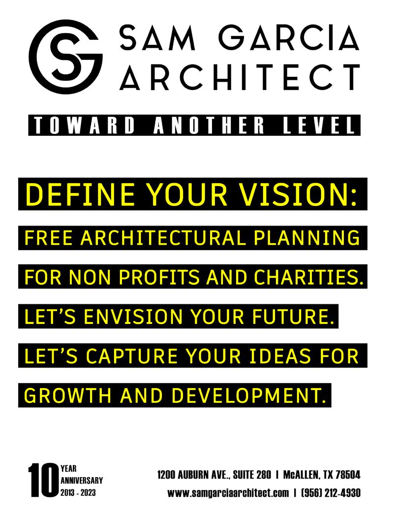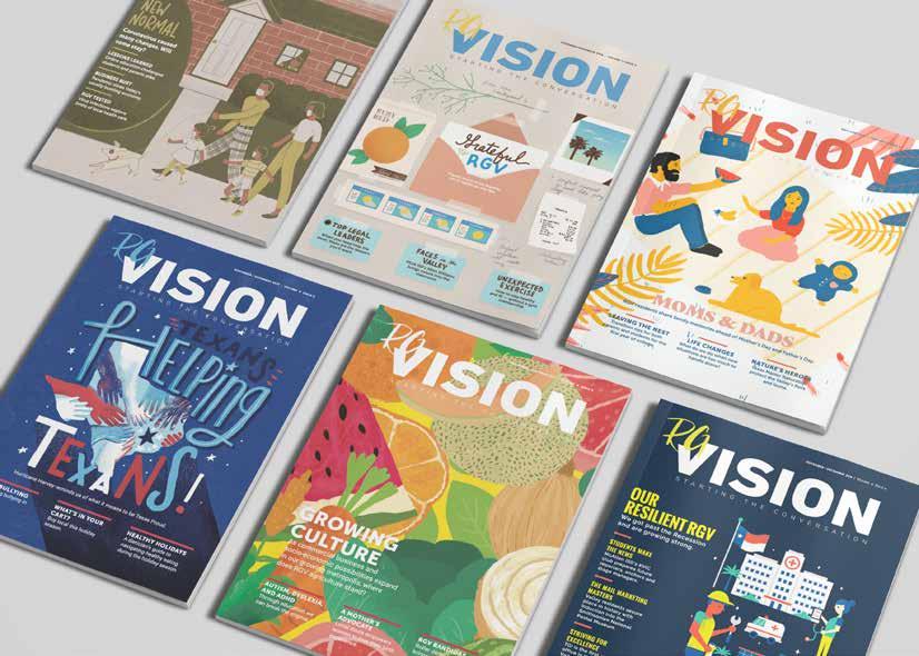 Copyright by RGVision Publications Inc. All rights reserved. Reproduction without expressed written permission of the publisher is prohibited. The opinions and views expressed in the magazine don’t necessarily reflect those of our advertisers or collaborators. RGVision magazine is published bi-monthly and circulates 10,000 copies across the Rio Grande Valley in 450 locations with a direct mail distribution to major hospitals and superintendents within Region 1. The RGVision office is located at 1912 Beaumont Ave., McAllen, TX 78501.