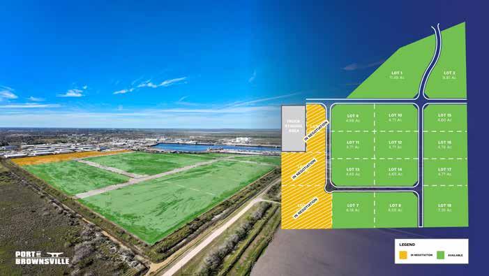 Bui lt fo r G r owi n g Busi n ess 118-ACRE SHOVEL-READY BUSINESS PARK LOT 1 11.49 Ac LOT 3 4.82 Ac LOT 5 5.82 Ac LOT 6 8.74 Ac LOT 7 6.16 Ac LOT 8 6.05 Ac LOT 4 3.48 Ac LOT 9 4.59 Ac LOT 10 4.71 Ac LOT 15 4.60 Ac LOT 16 4.76 Ac LOT 17 4.71 Ac LOT 18 7.35 Ac LOT 11 4.71 Ac LOT 12 4.71 Ac LOT 13 4.65 Ac LOT 14 4.65 Ac LOT 2 9.81 Ac OSTOSRD. As the only deep-water seaport directly on t he U.S.-Mexico border, t he Port of Brownsville is the ideal location for growing your business. 18 LOTS AVAILABLE ALL UTILITES IN PLACE 24/7 SECURED FACILITIES DIRECT ACCESS TO USMCA CORRIDOR CONNECTIVITY TO 3 CLASS 1 RAILROADS FOREIGN-TRADE ZONE #62 DESIGNATED SITE DIRECT ACCESS TO OVERWEIGHT CORRIDOR SUITED FOR MANUFACTURING & LOGISTICS 1000 Foust Rd. Brownsville, TX 78521 (956) 831-4592 portofbrownsville.com SCAN THE CODE TO WATCH VIDEO
