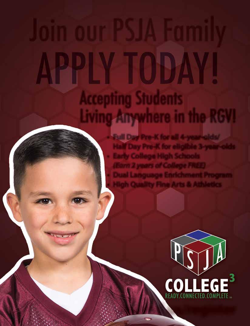Copyright by RGVision Publications Inc. All rights reserved. Reproduction without expressed written permission of the publisher is prohibited. The opinions and views expressed in the magazine don’t necessarily reflect those of our advertisers or collaborators. RGVision magazine is published bi-monthly and circulates 12,000 copies across the Rio Grande Valley in 420 locations with a direct mail distribution to major hospitals and Superintendents within Region 1. The RGVision office is located at 801 N Bryan Rd, Mission, TX 78572.