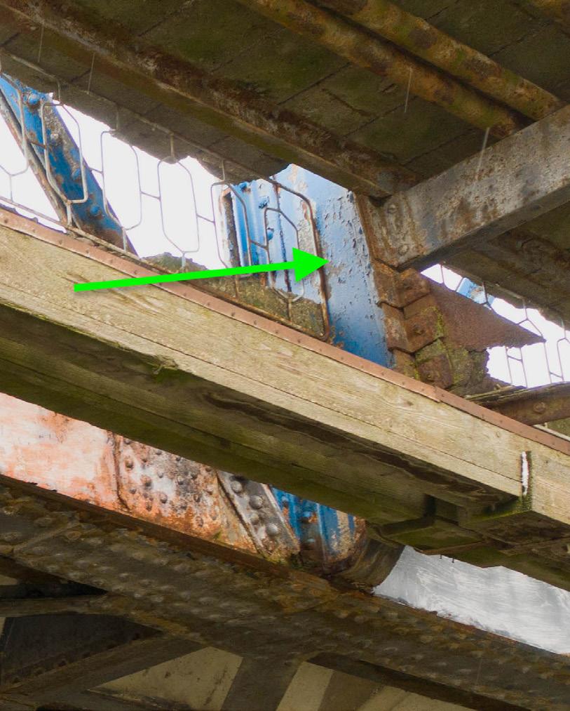 zone afectate de alge, muschi, licheni parament piatra destructurat, (elemente dislocate, rosturi macinate) in prag de colaps lacune profunde in parament (blocuri de piatra lipsa) murdarie, depuneri praf cabluri pretensionate in jurul pilei centrale