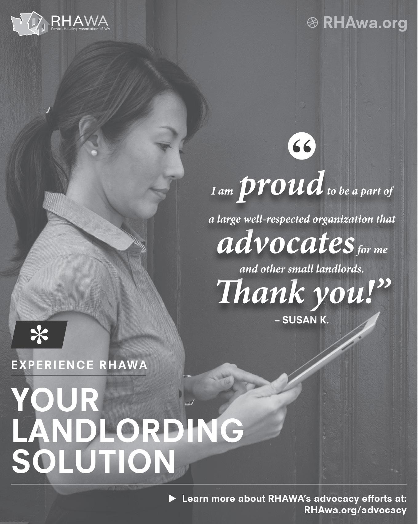 RHAWA Current is published every month by the Rental Housing Association of Washington. Copyright ©2023 RHAWA Current with all rights reserved. Reproduction or use without permission of editorial or graphic content in any manner is prohibited. All copyrights, trademarks, and servicemarks are property of their respective owners. P.O. Box 31103 Seattle, Washington, 98103.
