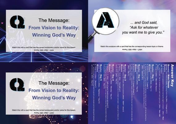 Day 5: Wise King Solomon (Key Verse: Kings 3:5–15) • Message: We all need wisdom and obedience to win God’s way. Wisdom is something you gain as continue to live and get older and gain life lessons. We are to ask God for guidance and wisdom in all matters of life. He does not want us to be in the dark or to fail. He has promised to give wisdom liberally to anyone who asks.