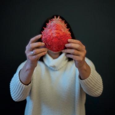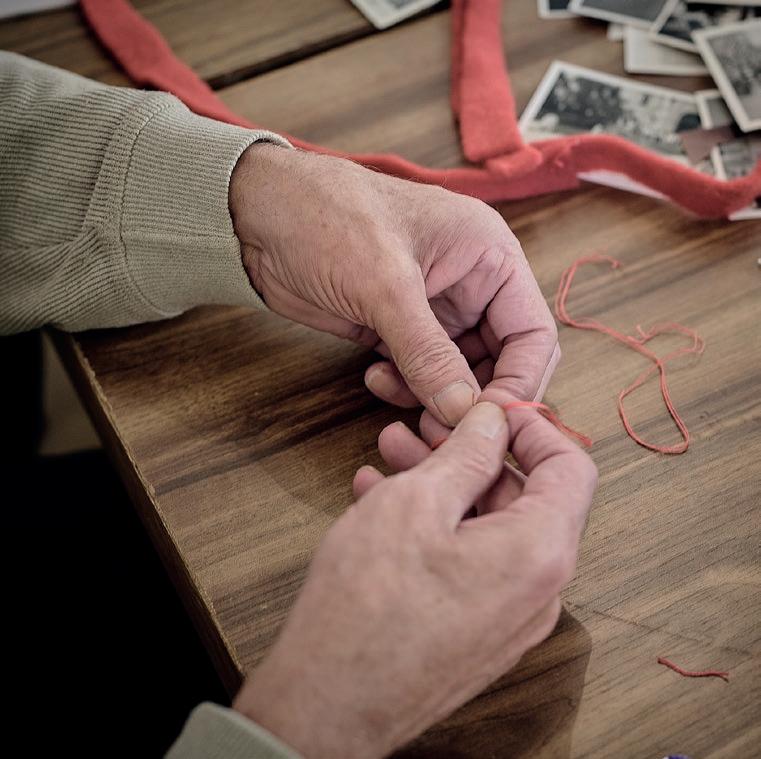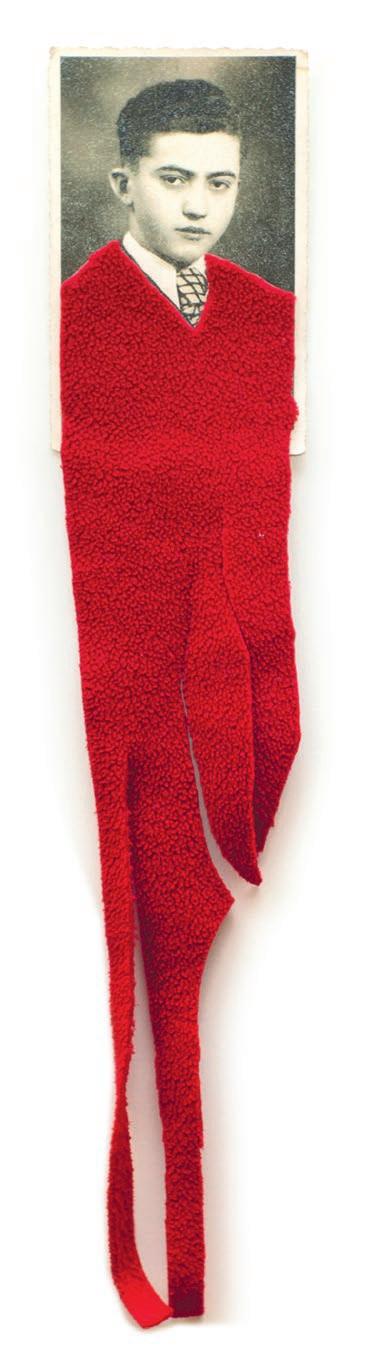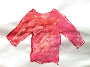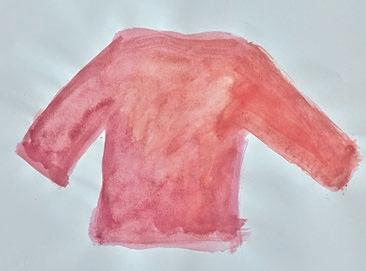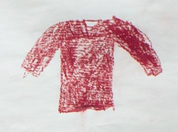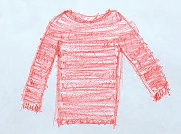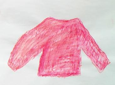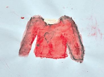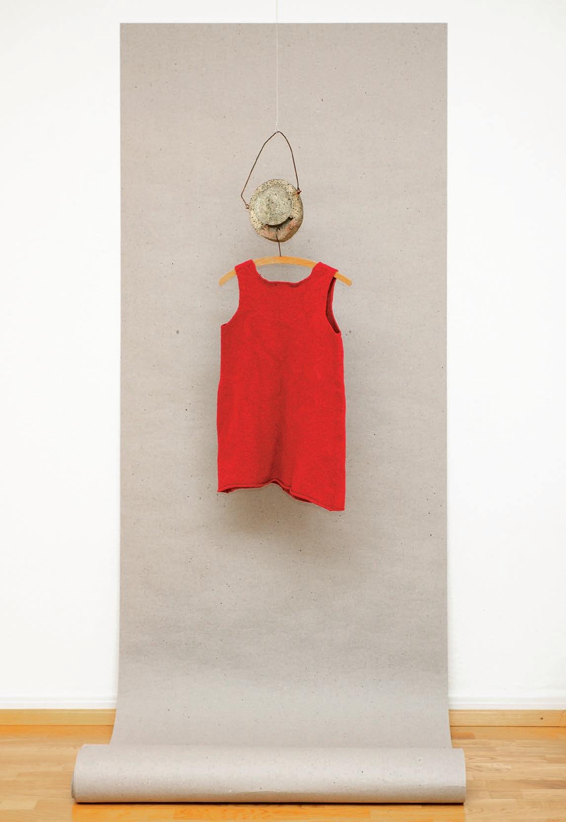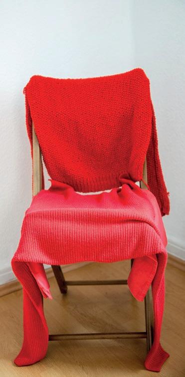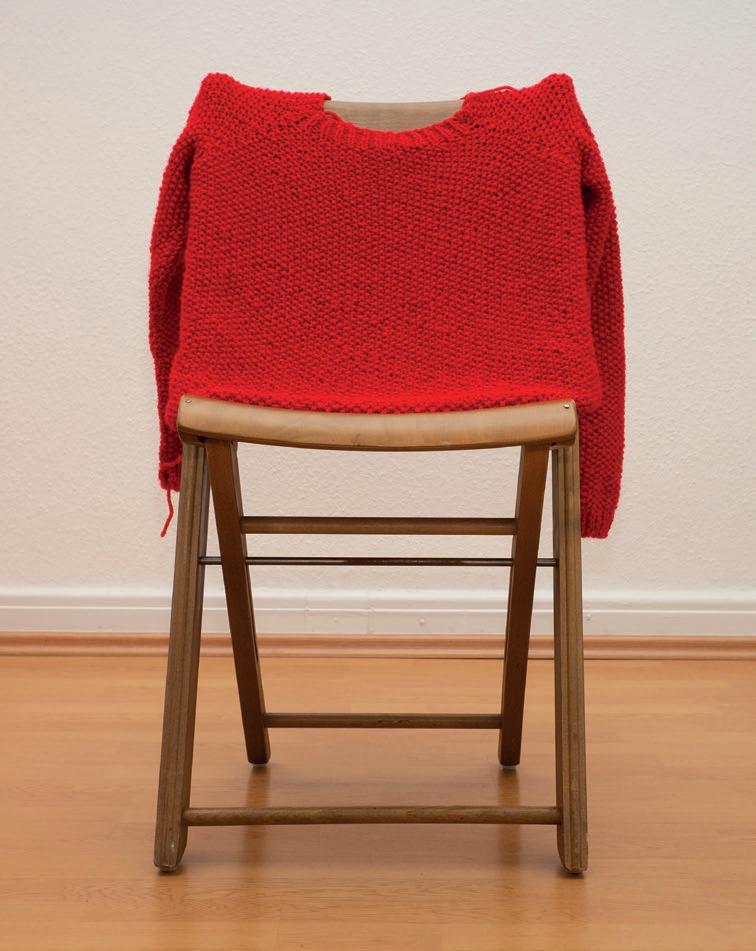 Ein handgestrickter, roter Pullover ihrer Mutter begleitet die Künstlerin als Kleidungs und Erinnerungsstück.