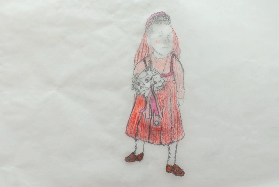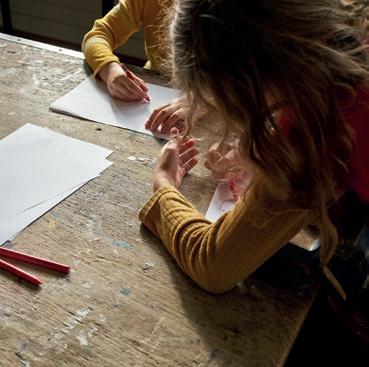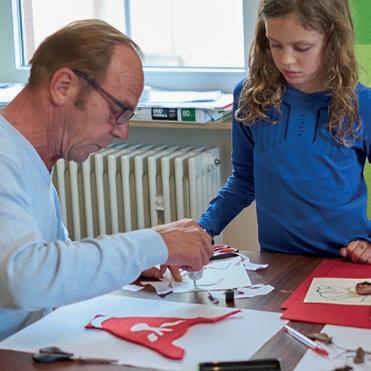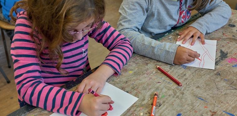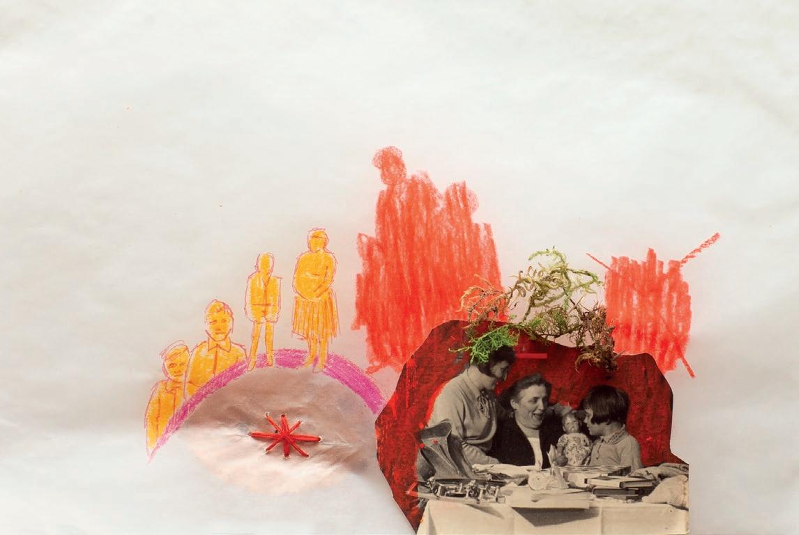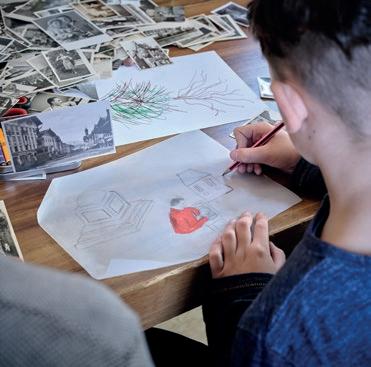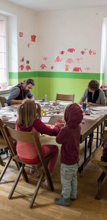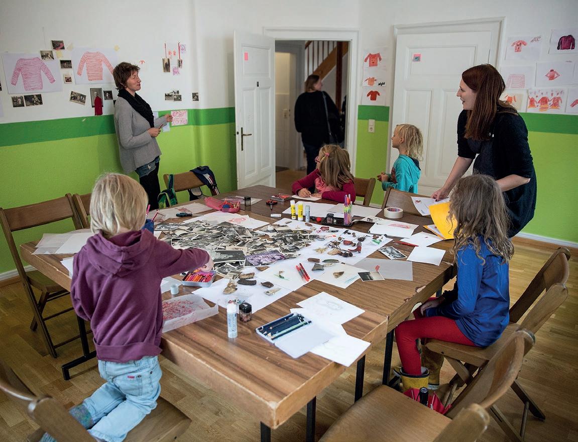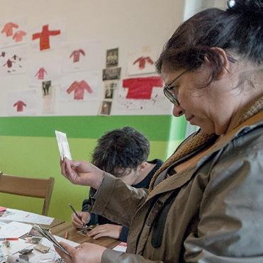 In einem großen Raum mit grünen Wänden sind Tische in der Mitte aufgestellt. Sie sind voll mit alten Fotos, Stiften, verschiedenen Papieren, Scheren, Kleber, Zweigen, Schneckenhäusern, Stoffresten und vielen weiteren Dingen. Sie setzt sich auf einen der Stühle am Tisch und schaut, was die Frau neben ihr macht: Durch ein transparentes Papier paust sie ein schwarzweißes Foto von einer Blume ab und gibt ihr mit den Wachsmalstiften wieder ihre Farbe zurück. Daneben malt sie Blumen in anderen Farbtönen, bis eine ganze Wiese entsteht. Das Mädchen nimmt ein Bild von der Mitte des Tisches, auf dem eine Gruppe fein säuberlich aufgereihter Personen zu sehen ist. Es erinnert sie an Familienfotos, die sie an Weihnachten immer machen. Sie malt die Umrisse der Personen mit roten Filzstiften nach und rahmt das Foto mit einem Wollfaden. Dann legt sie das Foto wieder zurück in die Mitte. Vielleicht will es jemand anderes noch vervollständigen.