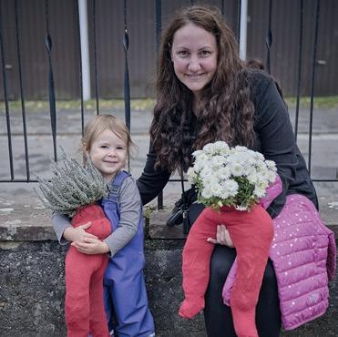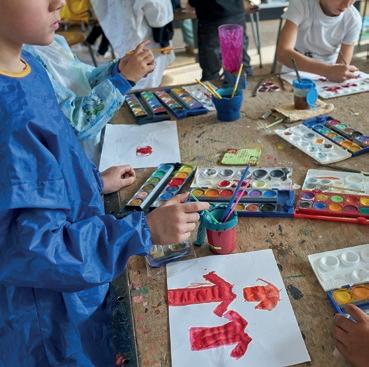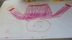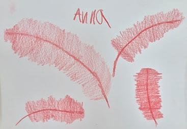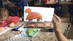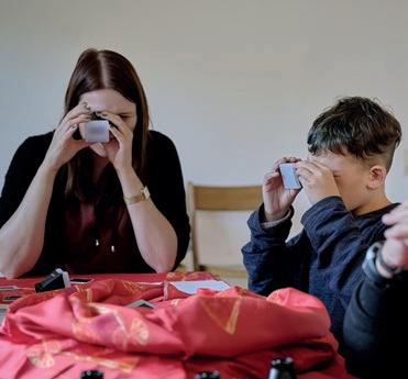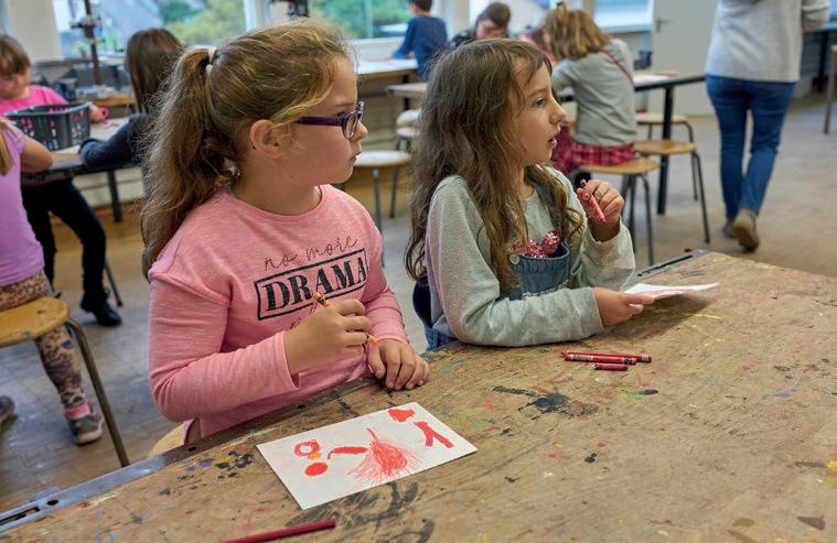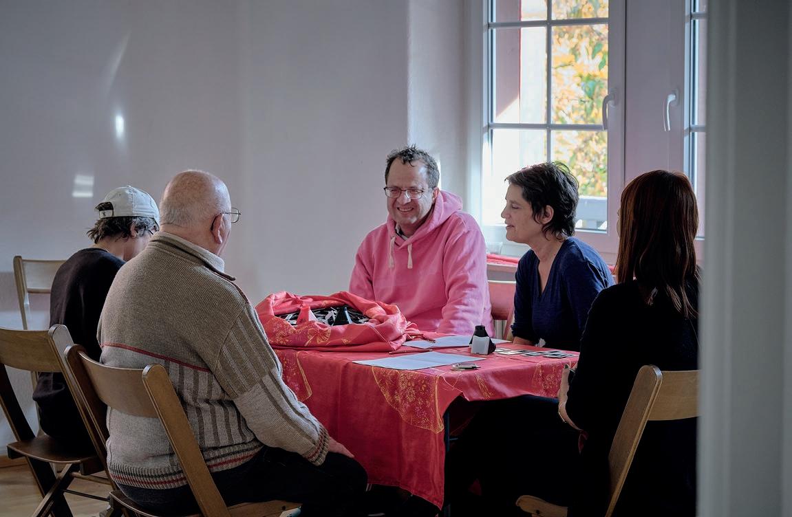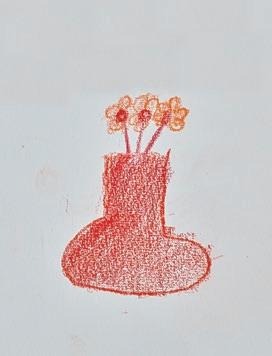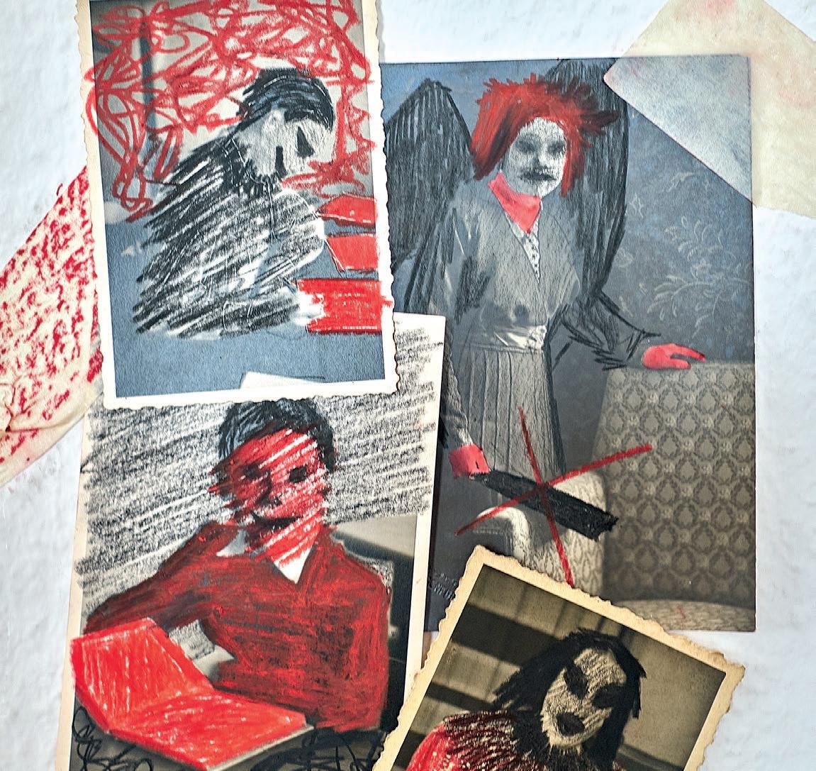 In einem großen Raum mit grünen Wänden sind Tische in der Mitte aufgestellt. Sie sind voll mit alten Fotos, Stiften, verschiedenen Papieren, Scheren, Kleber, Zweigen, Schneckenhäusern, Stoffresten und vielen weiteren Dingen. Sie setzt sich auf einen der Stühle am Tisch und schaut, was die Frau neben ihr macht: Durch ein transparentes Papier paust sie ein schwarzweißes Foto von einer Blume ab und gibt ihr mit den Wachsmalstiften wieder ihre Farbe zurück. Daneben malt sie Blumen in anderen Farbtönen, bis eine ganze Wiese entsteht. Das Mädchen nimmt ein Bild von der Mitte des Tisches, auf dem eine Gruppe fein säuberlich aufgereihter Personen zu sehen ist. Es erinnert sie an Familienfotos, die sie an Weihnachten immer machen. Sie malt die Umrisse der Personen mit roten Filzstiften nach und rahmt das Foto mit einem Wollfaden. Dann legt sie das Foto wieder zurück in die Mitte. Vielleicht will es jemand anderes noch vervollständigen.