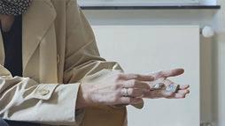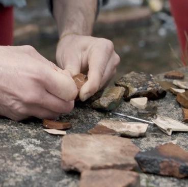 Sie läuft einen Raum weiter. Dort ist es etwas ruhiger. Ganz viele Scherben liegen auf einem Tuch auf dem Boden. Sie soll sich selbst eine Scherbe nehmen und mit einem Nagel ihren Namen in sie ritzen.