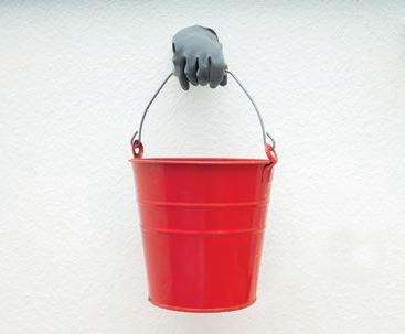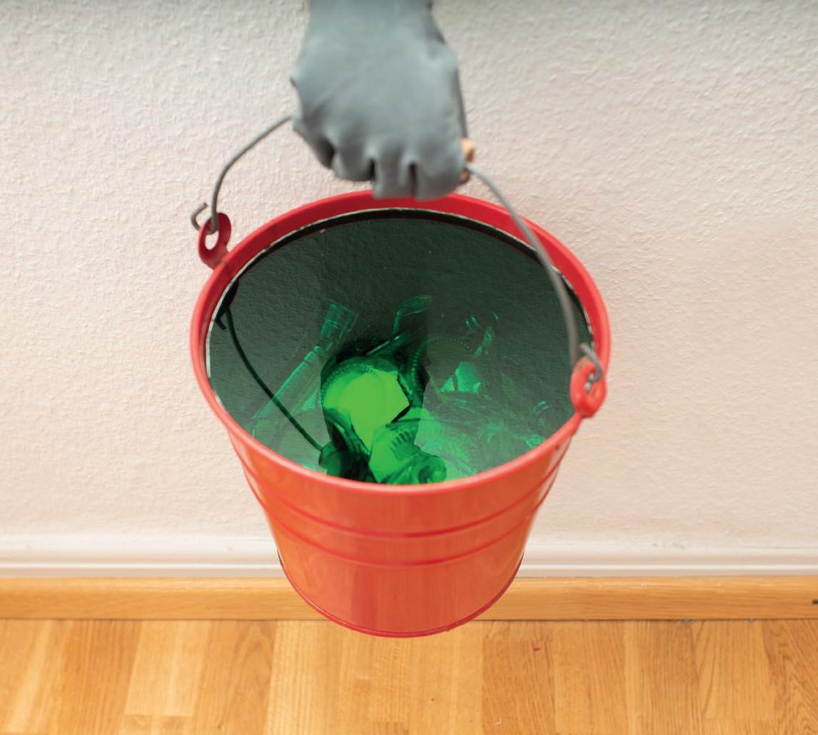 Glasscherben in Blecheimer, Acrylglas, Gummihandschuh