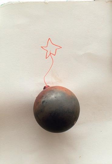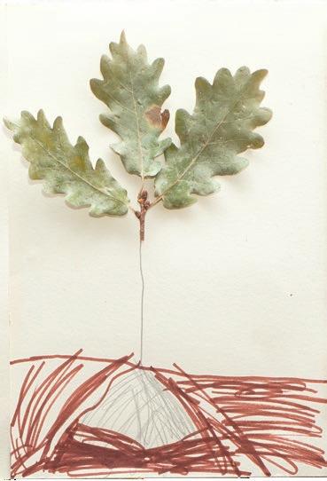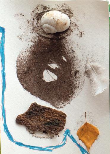 Porzellanfassung und Filzstift auf Papier, Christbaumkugel und Filzstift auf Papier, Eichenlaub und Filzstift auf Papier, Schneckenhaus, Rinde, Blatt, Feder, Sand und Filzstift auf Papier