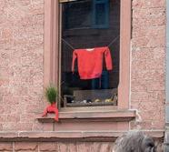 Roter Pullover im ehemaligen Textilgeschäft Roth in der Elmsteiner Hauptstraße.