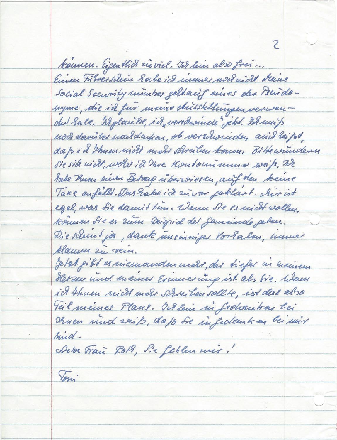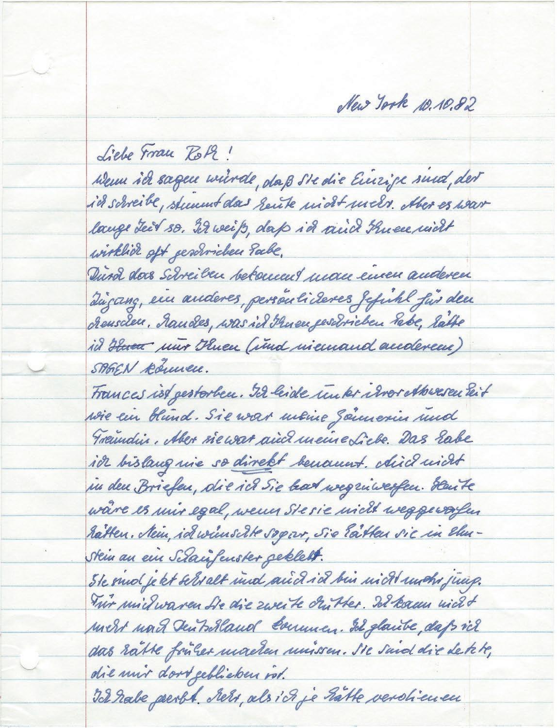 Letzter Brief von Toni an Hedwig Roth von 1982 (Ausschnitt)
