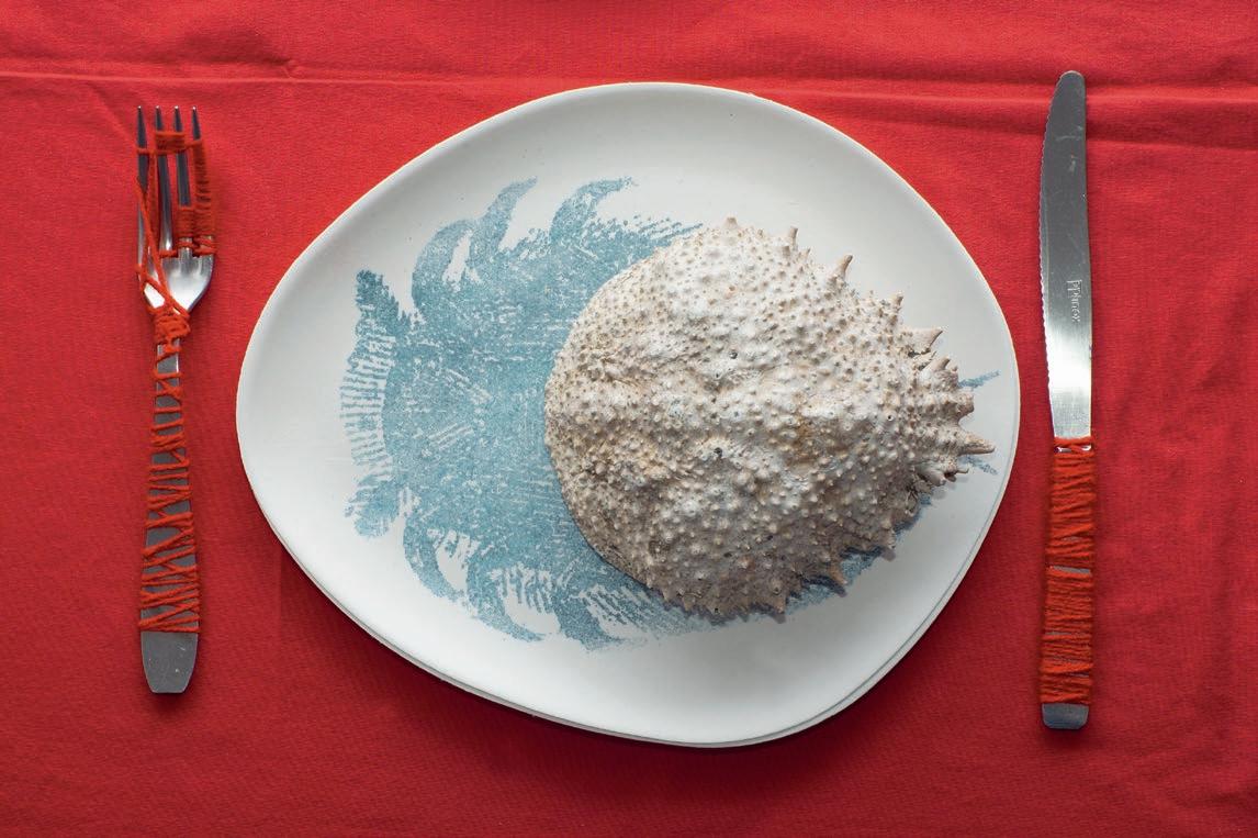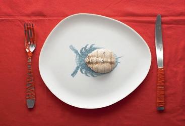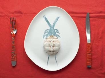 Krebspanzer, Nitrofrottage auf Pappteller, Stahlbesteck, Wolle