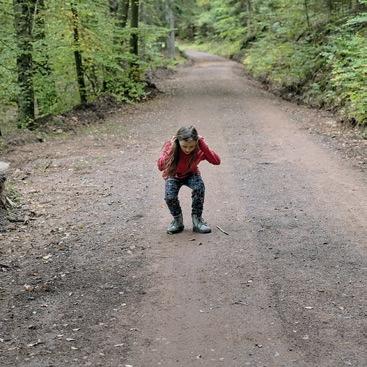 Wir steigen aus dem Bach und laufen Richtung Rehfelsen, dem einäugigen Kater Rambo hinterher. An der Kamera vorbei, gehen wir den bunten Herbstwald hinauf. Der Weg ist steil und die Gummistiefel finden schlecht Halt auf den rotorangenen Blättern. Simon und Moritz sind schnell, denn ihre Kinderbeine sind geübter im Gang auf unebenen Pfaden. „Heute habe ich auch rote Kinderbeine“, sag ich mir und beschleunige meine Schritte.