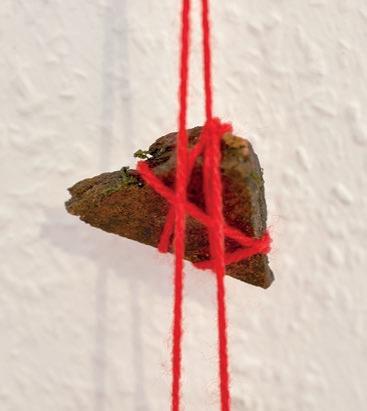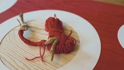Mit roter Wolle umwickelte Wurzel aus dem Elmsteiner Wald (Rekonstruktion)