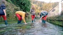 Wir treffen uns im Pfarrhaus. Alle ziehen ihre Wollpullis an und ihre Hosen über den Strumpfhosen aus. Wir lachen, das Bild unserer roten Beine gefällt uns jetzt schon. Nachdem uns erzählt wurde, an welchen Orten wir filmen werden, ziehen wir die Gummistiefel über unsere roten Füße und laufen mit einem leeren Flechtkorb und einem Eimer mit Äpfeln zum Speyerbach. Wir suchen uns eine flache Stelle für den Einstieg. Die Gummistiefel halten erstaunlich warm, aber man muss aufpassen, dass kein Wasser von oben hineinläuft. Wir haben noch ein paar Stationen des Filmdrehs vor uns. Es braucht ein bisschen, bis die Kamera richtig eingestellt ist. Ich fange an, auf dem Grund des Baches nach Scherben zu suchen, sie den anderen zu zeigen, mit ihren Fundstücken zu vergleichen, zu überlegen, von welchem Ganzen sie einmal Teil waren, sie einzuritzen, in den Korb zu legen. Das Wasser wird von den anderen roten Beinen um mich herum aufgewühlt. Deswegen halte ich einen Stein für eine Scherbe, hole ihn aus dem kalten Wasser und werfe ihn wieder zurück. Das Rauschen des Wassers vermischt sich mit den Stimmen um mich herum und dem Quietschen der Nägel auf den Scherben. Eine Wandergruppe läuft vorbei und schaut fragend. Gebückte Körper und rote Beine, die staksend das Wasser durchqueren, suchende Hände, rot vom kalten Nass. Erst durch die Blicke der Wandernden fällt mir wieder auf, dass eine Kamera auf uns gerichtet ist.