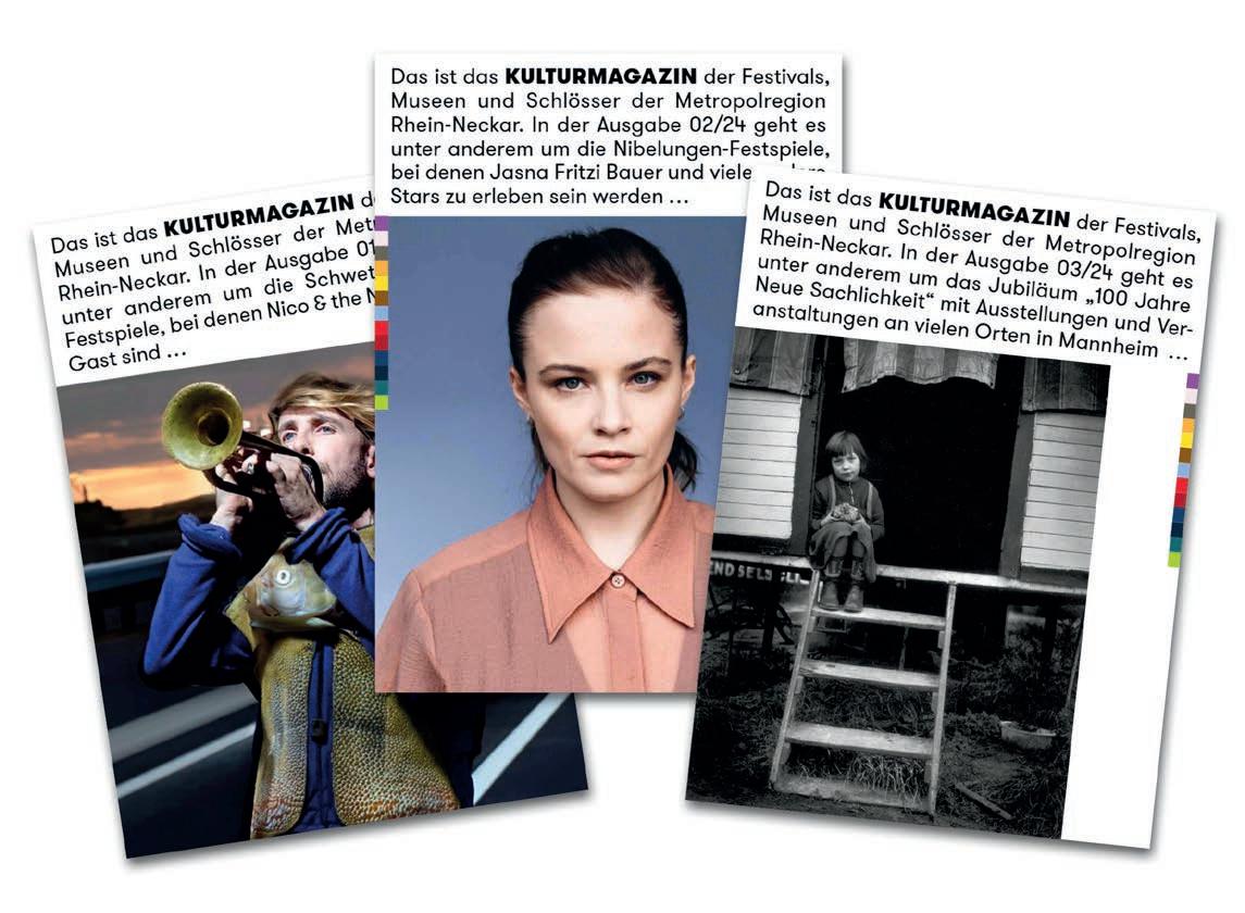 Das Kulturmagazin des Kulturbüros Rhein-Neckar in Zusammenarbeit mit den regionalen Netzwerken „Die Festivals“ und „Die Museen und Schlösser“ informiert in jährlich drei Ausgaben Kulturinteressierte über die Höhepunkte der Veranstaltungen in der MRN. Dabei bietet die Publikation nicht nur in den gedruckten Ausgaben einen sehr umfangreichen Eventkalender sowie Interviews und Artikel mit informativen und spannenden Blicke hinter die Kulissen der Kulturszene. Das Angebot ist auch über die Webseite und die Social Media – Accounts (Facebook, Instagram: „kulturregion.rheinneckar“) einzusehen und abrufbar. Im Februar, Juni und Oktober erschienen die drei Ausgaben 2024. Die Sommerausgabe bot erstmals ergänzende Programmtipps für Kinder und Familien.
