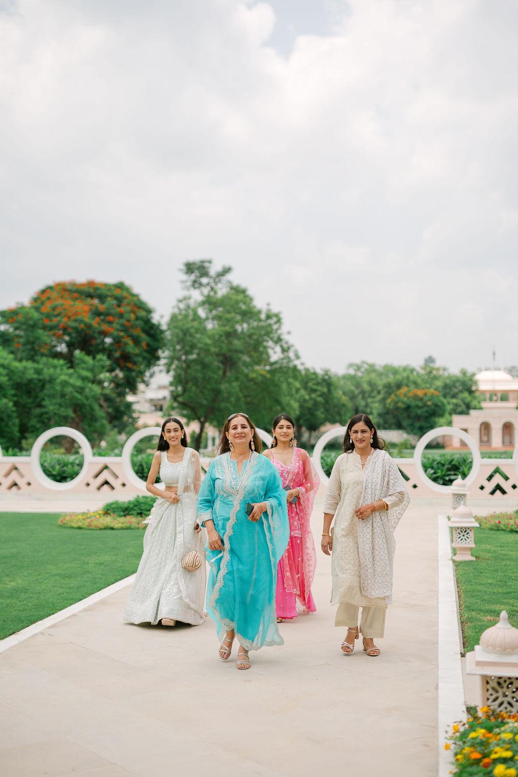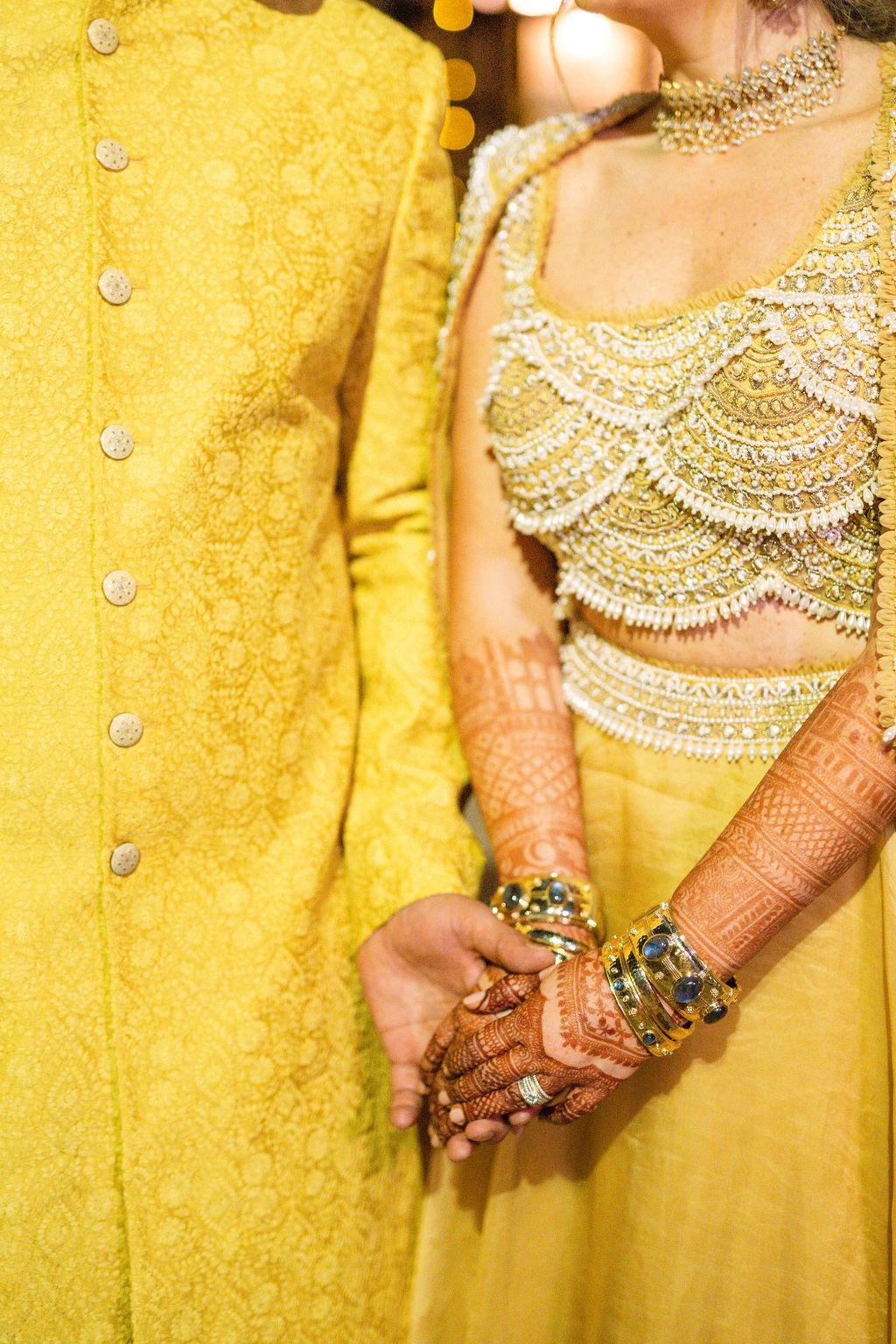 The guests all wear mustard or gold. Haldi is considered auspicious and signifies protection. Its color brings prosperity to the couple to start off their new life together.