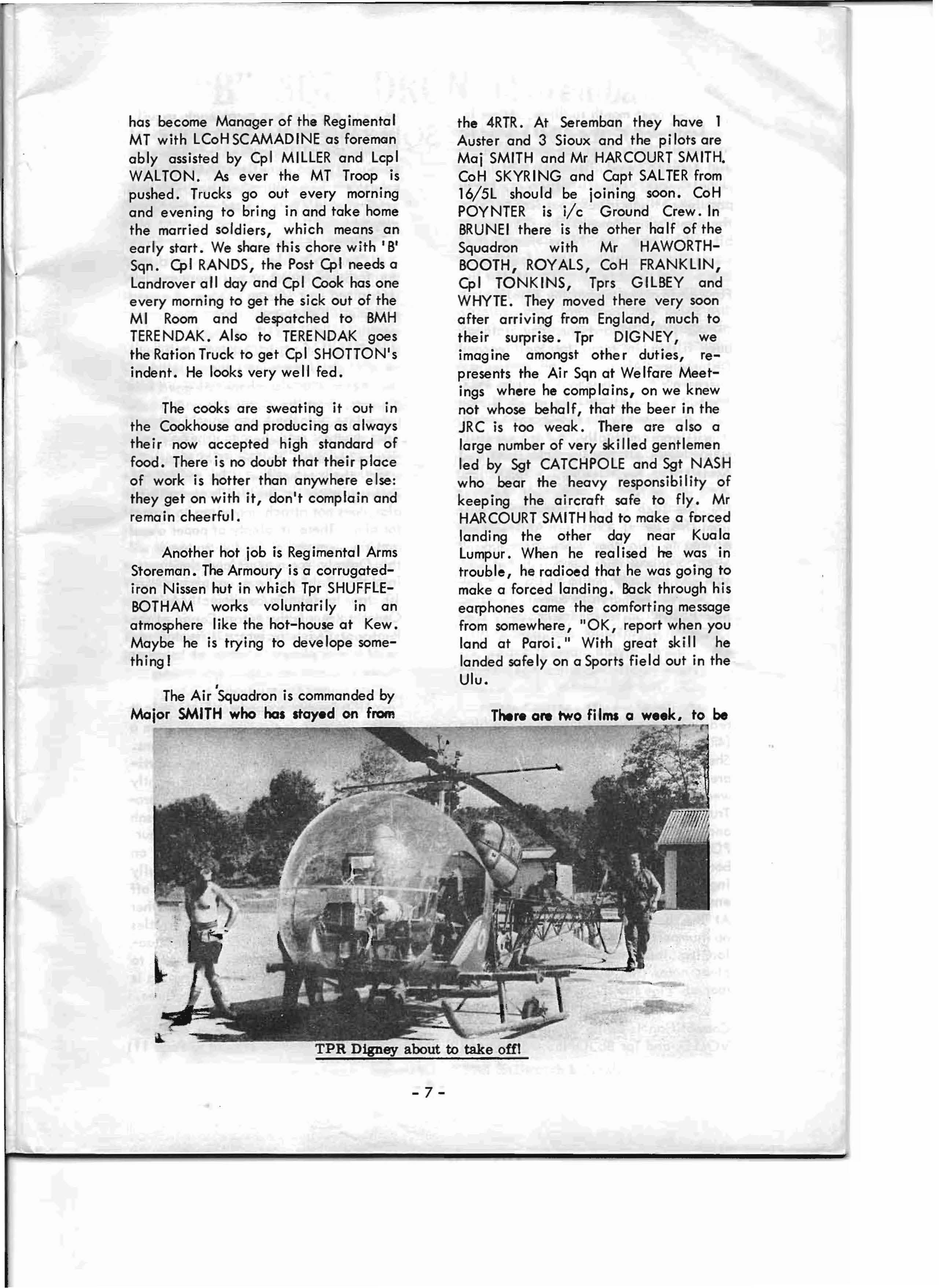 the 4RTR. At Seremban they have 1 Auster and 3 Sioux and the pi lots are Maj SMITH and Mr HARCOURT SMITH. CoH SKYRING and Capt SALTER from 16/5L should be joining soon. CoH POYNTER is i/c Ground Crew. In BRUNEI there is the other half of the Squadron with Mr HAWORTHBOOTH, ROYALS, CoH FRANKLlN, Cpl TONKINS, Tprs GILBEY and WHYTE. They moved there very soon after arriving from England, much to their surprise. Tpr DIGNEY, we imagine amongst other duties, represents the Air Sqn at Welfare Meetings where he complains, on we knew not whose behalf, that the beer in the JRC is too weak. There are also a large number of very skilled gentlemen led by Sgt CATCHPOLE and Sgt NASH who bear the heavy responsibility of keeping the aircraft safe to fly. Mr HARCOURT SMITH had to make a forced landing the other day near Kuala Lumpur. When he realised he was in trouble, he radioed that he was going to make a forced landing. Back through his earphones came the comforting message from somewhere, "OK, report when you land at ParoL" With great skill he landed safely on a Sports field out in the Ulu.
