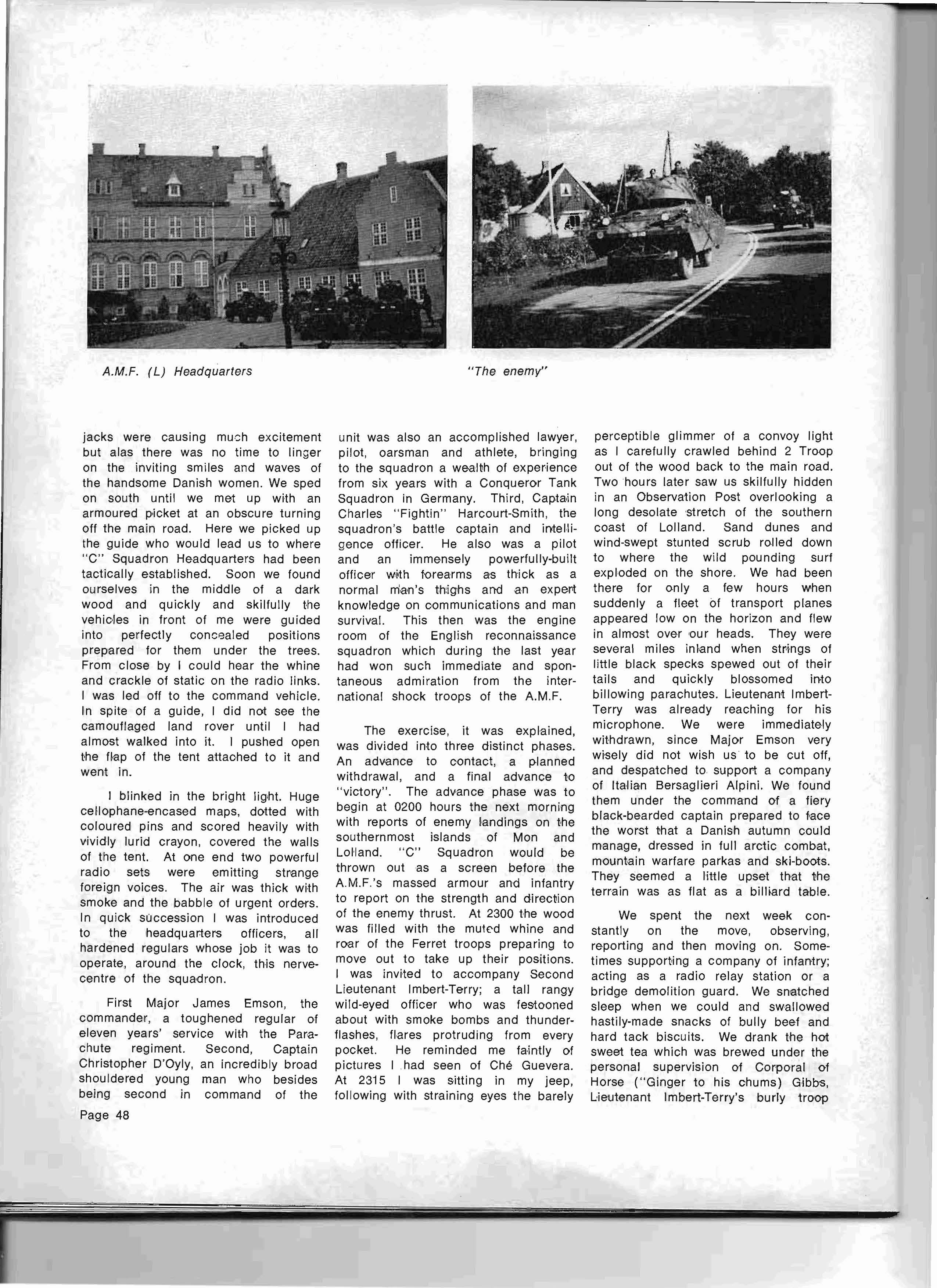The exercise, it was explained, was divided into three distinct phases. An advance to contact, a planned withdrawal, and a final advance t,o "victory". The advance phase was to begin at 0200 hours the next morning with reports of enemy landings on t,he southernmost islands of Man and LoHand. "C" Squadron would be thrown out as a screen before the A.M.F.'s massed armour an{! infantry to report on t'he strength and direction of the enemy thrust. At 2300 the wood was filled with the mutC'd whine and roar of the Ferret troops preparing to move out to take up their positions. I was invited to accompany Second Lieutenant Imberl-Terry; a tall rangy wild-eyed officer who was festooned about with smoke bombs and thunderflashes, flares protruding from every pocket. He reminded me faintly of pictures I had seen of Che Guevera. At 2315 I was sitting in my jeep, following with straining eyes the barely