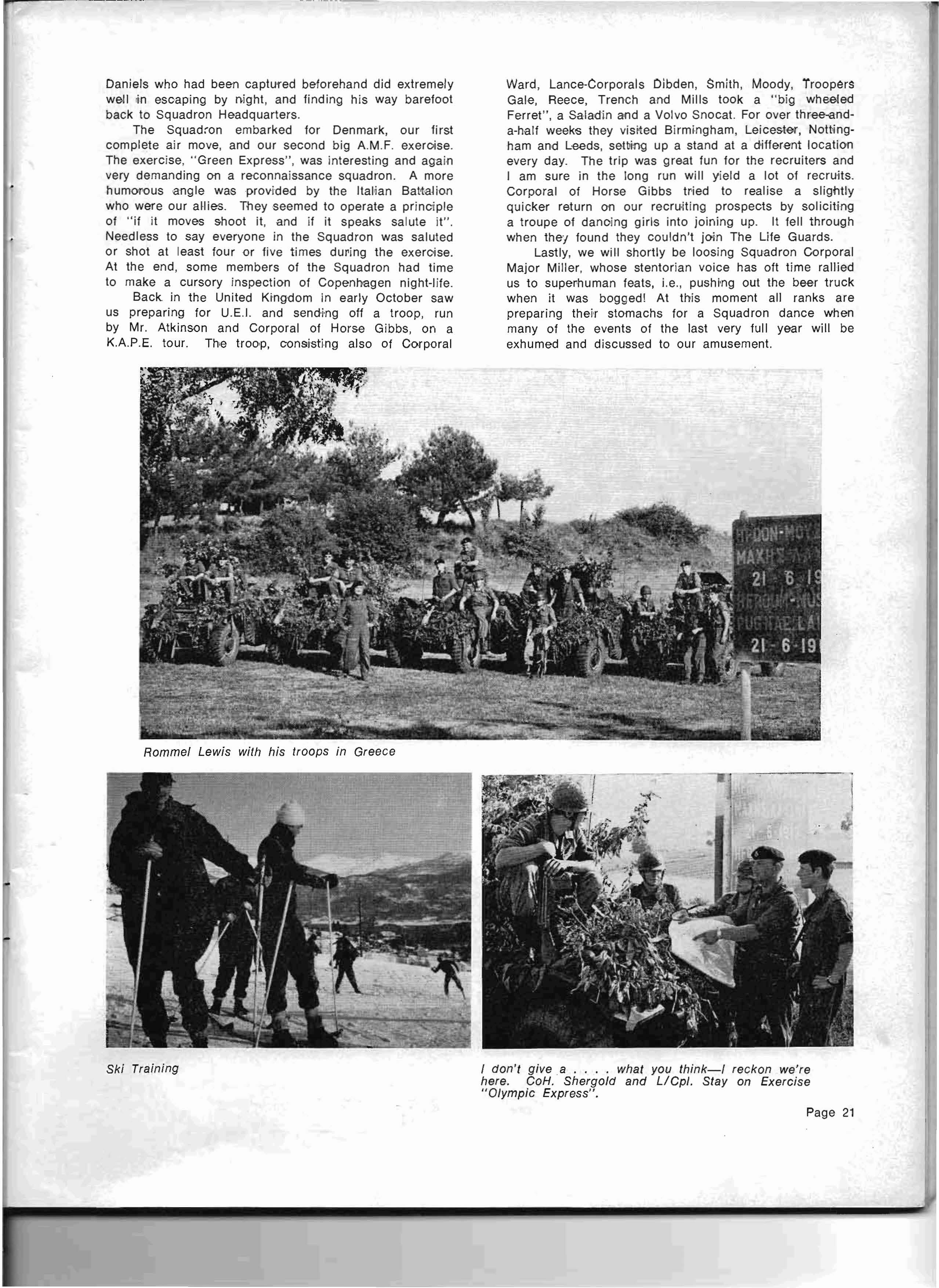 The AC.E. Mobile Force rear-ed its ugly head once more on our return and Regimental Headquarters and "C" Squadron were in the throes of preparing for Exercise "Golden Arrow" on the Stantord Practical Training area when we sUddenly received the signal that we were to put "8" Squadron on seventy-two hours notice for Northern Ireland. Forty-eight hours later they departed in the L.S.L. Sir Percivale from Marchwood, and just about the same time Regimental Headquarters and "C" Squadron trundled up to Stanford in their armoured cars. Exercise "Golden Arrow" was designed as a work-up exercise for Exercise "Green Express", wh,ich took place in Denmark during the last three weeks of September and which is the subject of a separate article later in the magazine. "8" Squadron meanwhile had arrived in Northern Ireland where they were stationed in a Dritl Hall in Holywood, just outside Belfast Life to them there was very busy and they wer'e employed ·in a variety of roles, including flag marches, patrols, guarding vulnerable points, road blocks and check pOints. At one point the whole squadron was dismounted tor about a week due to an apparent shortage ot infantry, but probably t.he highlight of th'eir tour was the events of the week-end of the 11th and 12th of October when our armoured cars led the infantry down the Shankill Road against a large mob (see the cover photograph). We are glad to say that they all returned safely in early December. For "A" Squadron, meanwhile, the problems of Europe are a thing of the past and they departed for Sharjah at the end of September. Much news has percolated back from the sandy wastes where they are stationed, most of it under the rather dubious heading of a publication called "The Desert Rose".