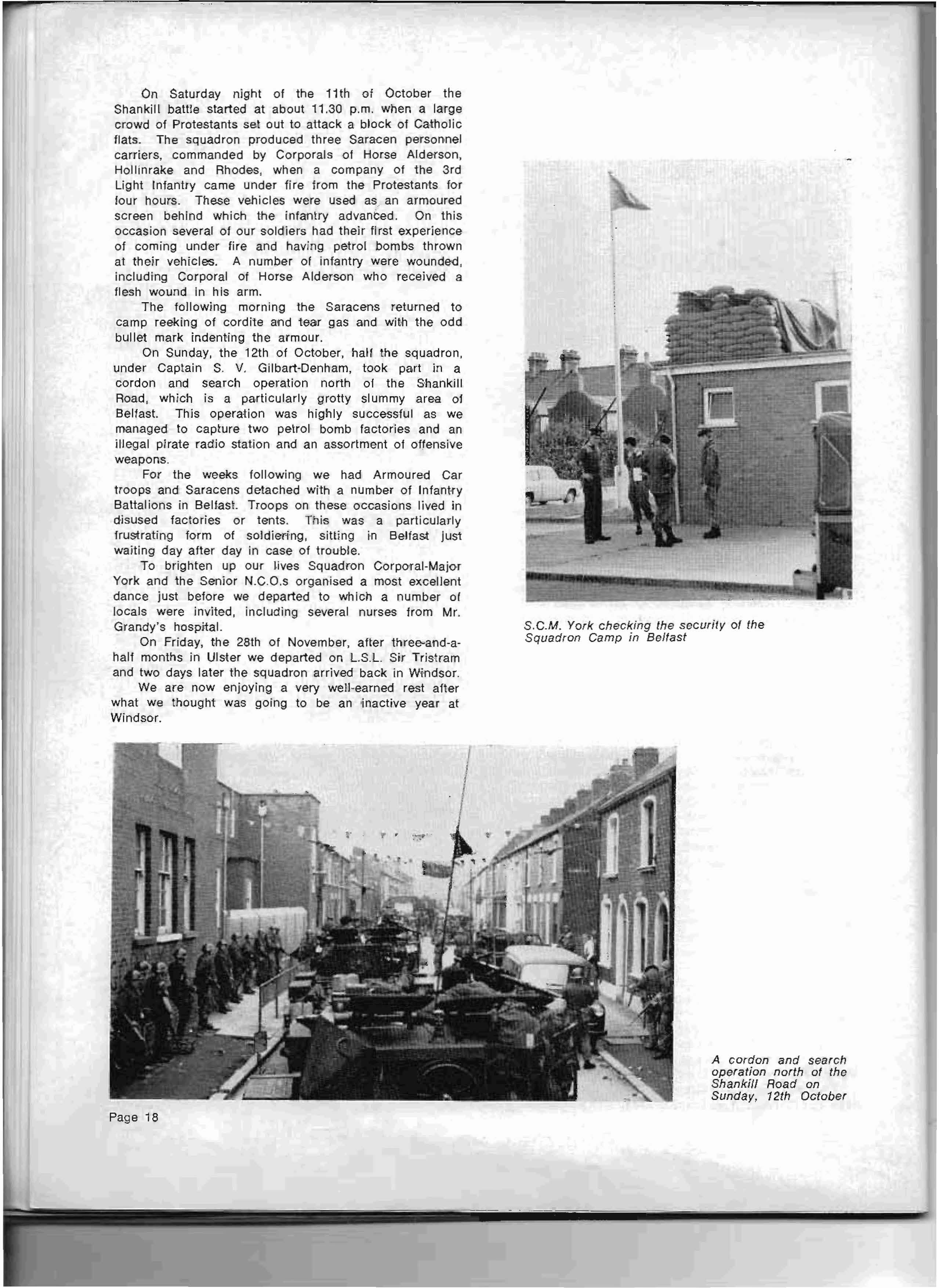 On Saturday night of the 11th of October the Shankill battle started at about 11.30 p.m. when a large crowd of Protestants set out to attack a block of Catholic flats. The squadron produced three Saracen personnel carriers, commanded by Corporals of Horse Alderson, Hollinrake and Rhodes, when a company of the 3rd Light Infantry came under fire from the Protestants for lour hours. These vehicles were used as. an armoured screen behind which the infantry advanCed. On this occasion several of our soldiers had their first experience of coming under fire and having petrol bombs thrown at their vehicles. A number of infantry were wounded, including Corporal of Horse Alderson who received a flesh wound in h is arm.