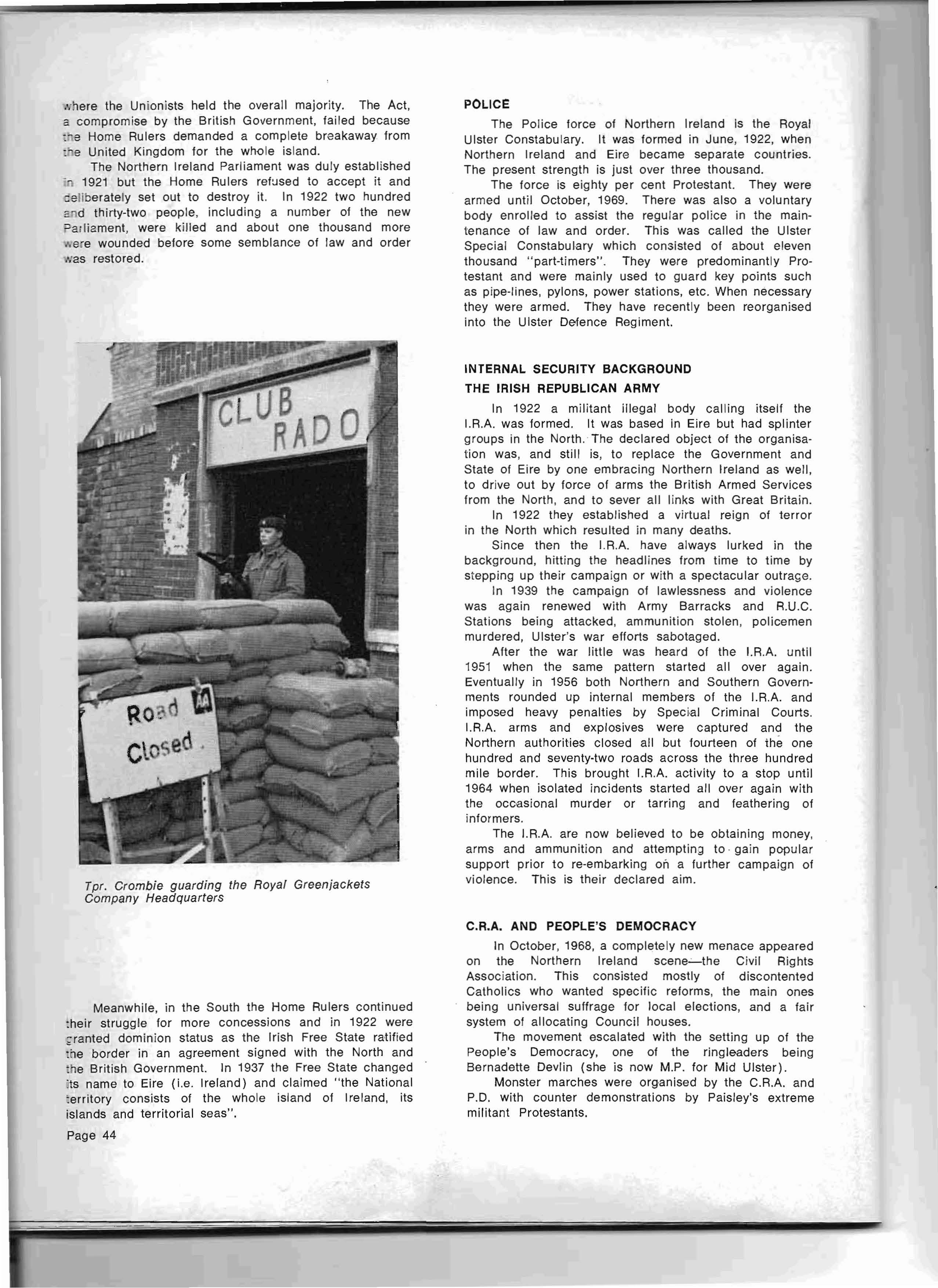 Editor: Captain G. R. Petherick. The Cover Depicts: A Saracen of "B" Squadron leading a patrol through the debris in Shankill Road, Belfast, Oct., 1969 Photograph reproduced by courtesy of The Press Association Ltd., London.