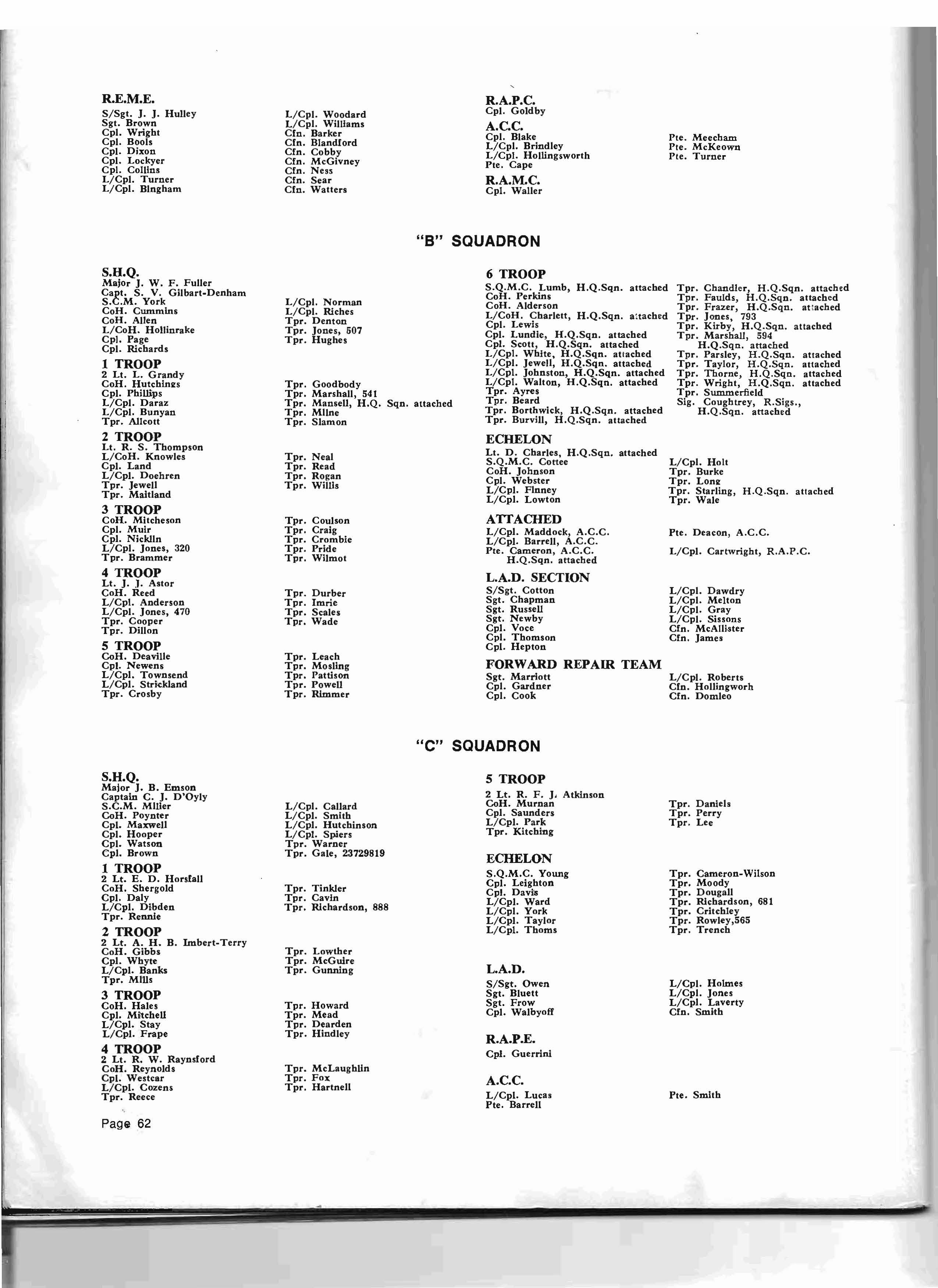 The changes in the Squadron, although numerous, have left us with many of the same laces who were with us in Singapore. We have lost Squadron Corporal Major Turtle, to whom we wish every success in civilian life, Harry, to sort out the Household Cavalry Regiment, Corporals of Horse Hunt, WaterwoHh, Venn and Rhodes and ma,ny others.