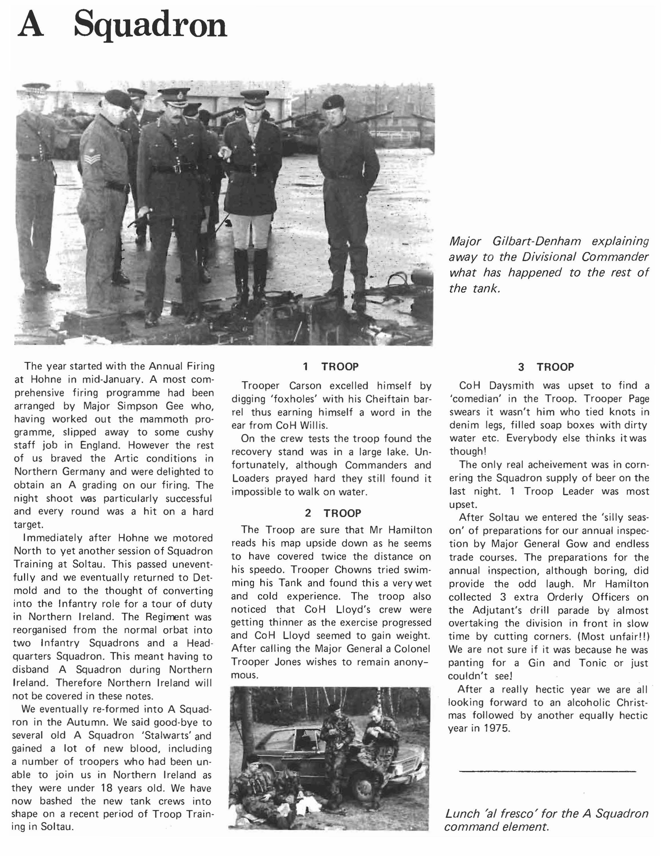 Immediately after Hohne we motored North to yet another session of Squadron Training at Soltau. This passed uneventfully and we eventually returned to Detmold and to the thought of converting into the Infantry role for a tour of duty in Northern Ireland. The Regiment was reorganised from the normal orbat into two I nfantry Squadrons and a Headquarters Squadron. This meant having to disband A Squadron during Northern Ireland. Therefore Northern Ireland will not be covered in these notes. We eventually re-formed into A Squadron in the Autumn. We said good-bye to several old A Squadron 'Stalwarts' and gained a lot of new blood, including a number of troopers who had been unable to join us in Northern Ireland as they were under 18 years old. We have now bashed the new tank crews into shape on a recent period of Troop Train· ing in Soltau.