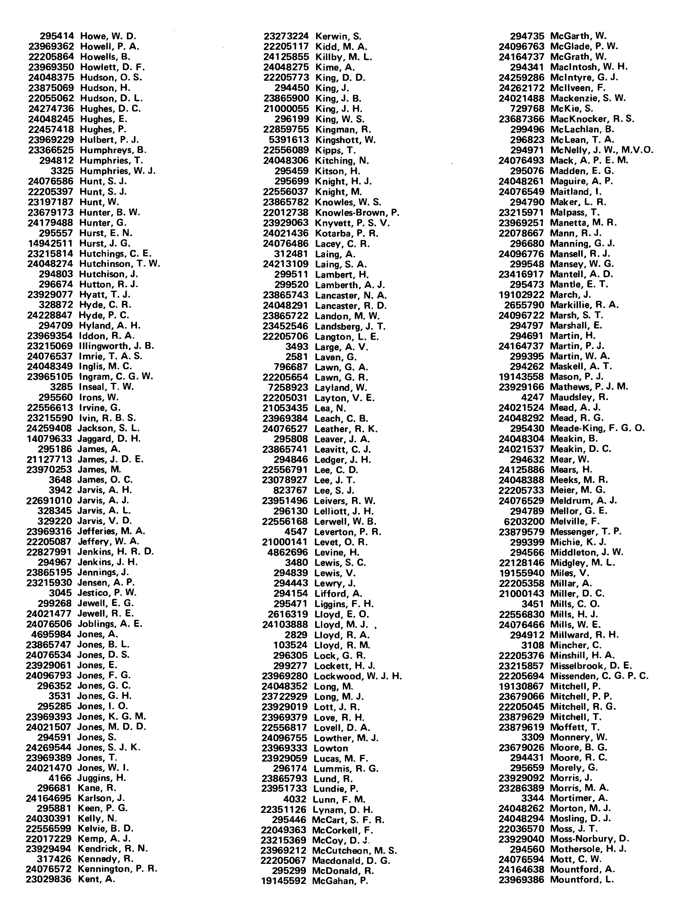 23273224 Kerwin. S. 22205117 Kidd. M. A. 24125855 Killby. M. L. 24048275 Kime, A. 22205773 King. D. D. 294450 King. J. 23865900 King, J. B. 21000055 King. J. H. 296199 King, W. S. 22859755 Kingman, R. 5391613 Kingshott, W. 22556089 Kipps. T. 24048306 Kitching, N. 295459 Kitson, H. 295699 Knight, H. J. 22556037 Knight. M. 23865782 Knowles, W. S. 22012738 Knowles-Brown, P. 23929063 Knyvett, P. S. V. 24021436 Kotarba, P. R. 24076486 Lacey, C. R. 312481 Laing, A. 24213109 Laing. S. A. 299511 Lambert, H. 299520 Lamberth, A. J. 23865743 Lancaster, N. A. 24048291 Lancaster, R. D. 23865722 Landon, M. W. 23452546 Landsberg, J. T. 22205706 Langton, L. E. 3493 Large, A. V. 2581 Laven, G. 796687 Lawn. G. A. 22205654 Lawn,G. R. 7258923 Layland. W. 22205031 Layton, V. E. 21053435 Lea. N. 23969384 Leach. C. B. 24076527 Leather, R. K. 295808 Leaver, J. A. 23865741 Leavitt, C. J. 294846 Ledger. J. H. 22556791 Lee, C. D. 23078927 Lee, J. T. 823767 Lee, S. J. 23951496 Leivers, R. W. 296130 Lelliott, J. H. 22556168 Lerwell, W. B. 4547 Leverton, P. R. 21000141 Levet. O. R. 4862696 Levine, H. 3480 Lewis, S. C. 294839 Lewis, V. 294443 Lewry, J. 294154 Lifford, A. 295471 Liggins, F. H. 2616319 Lloyd. E. O. 24103888 Lloyd, M. J .• 2829 Lloyd, R. A. 103524 Lloyd, R. M. 296305 Lock. G. R. 299277 Lockett, H. J. 23969280 Lockwood. W. J. H. 24048352 Long, M. 23722929 Long, M. J. 23929019 Lott, J. R. 23969379 Love, R. H. 22556817 Lovell. D. A. 24096755 Lowther, M. J. 23969333 Lowton 23929059 Lucas, M. F. 296174 Lummis. R. G. 23865793 Lund. R. 23951733 Lundie, P. 4032 Lunn, F. M. 22351126 LYnam, D. H. 295446 McCart, S. F. R. 22049363 McCorkell. F. 23215369 McCoy. D. J. 23969212 McCutcheon. M. S. 22205067 Macdonald. D. G. 295299 McDonald, R. 19145592 McGahan. P.