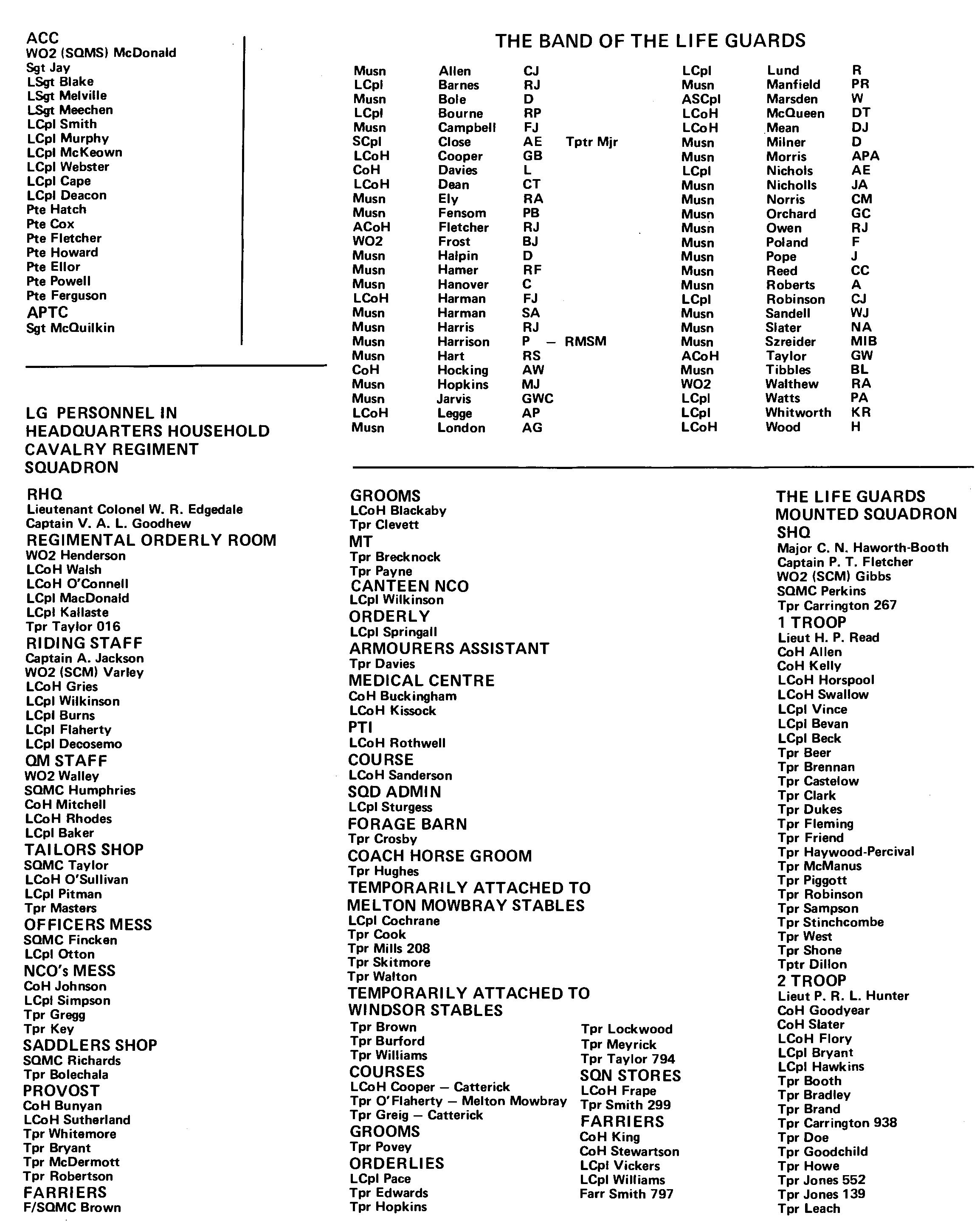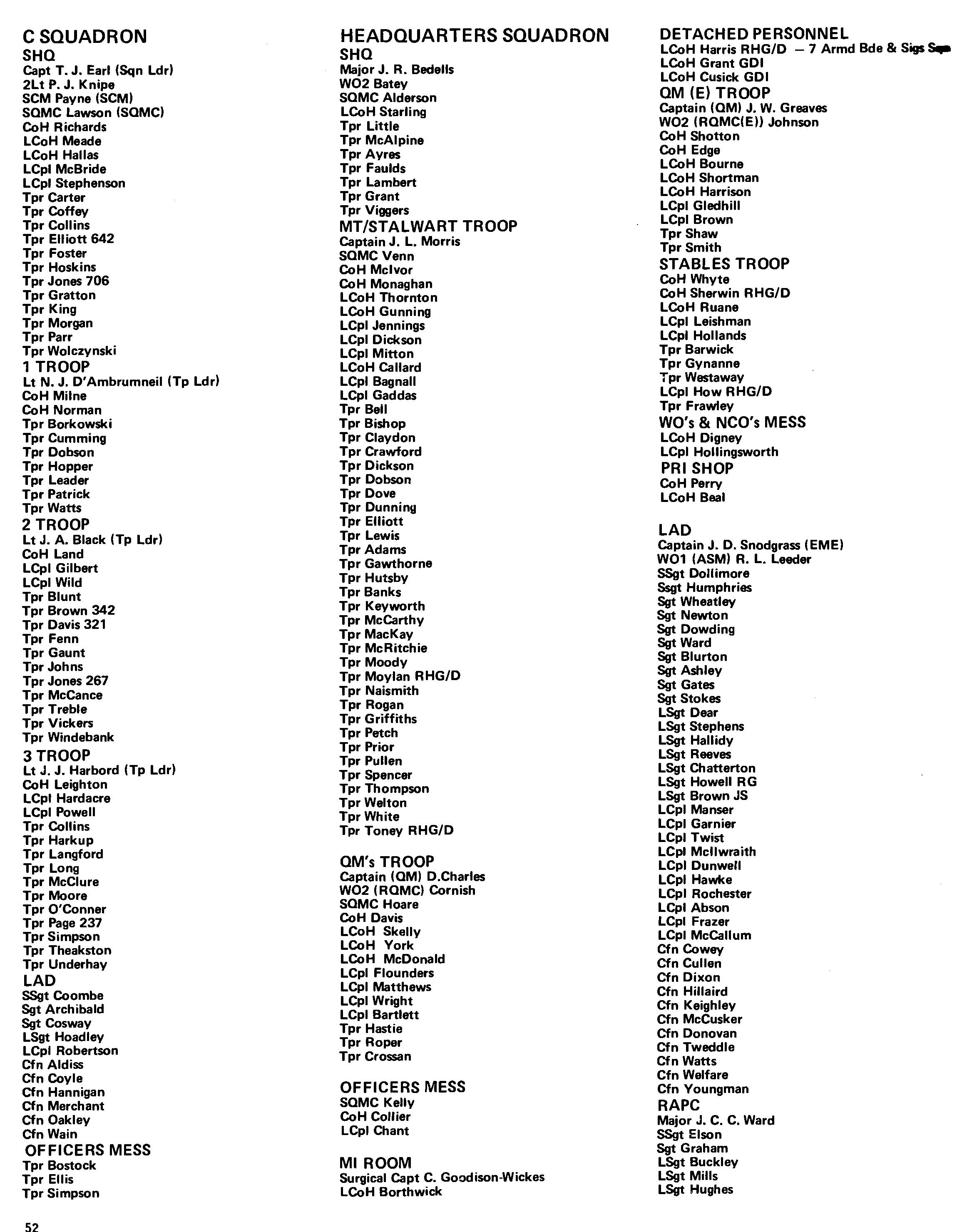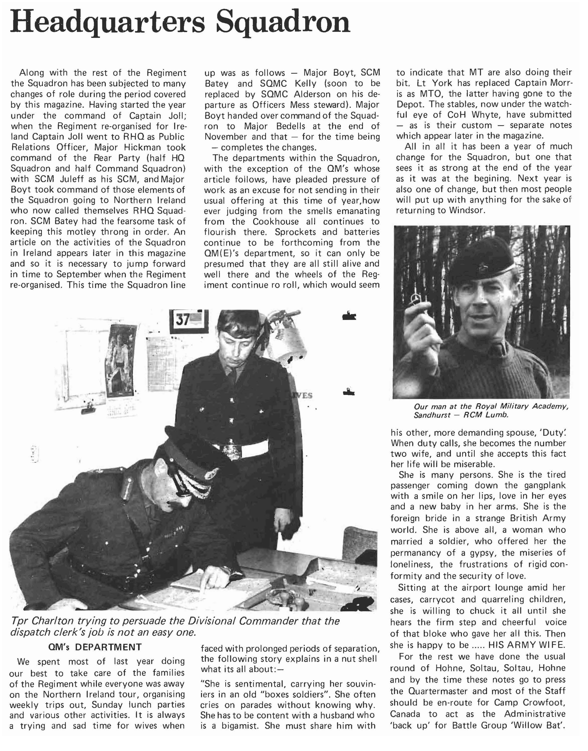 Along with the rest of the Regiment the Squadron has been subjected to many changes of role during the period covered by this magazine. Having started the year under the command of Captain Joll; when the Regiment re-organised for Ireland Captain Joll went to RHO as Public Relations Officer, Major Hickman took command of the Rear Party (half HO Squadron and half Command Squadron) with SCM Juleff as his SCM, and Major Boyt took command of those elements of the Squadron going to Northern Ireland who now called themselves RHO Squadron. SCM Batey had the fearsome task of keeping this motley throng in order. An article on the activities of the Squadron in Ireland appears later in this magazine and so it is necessary to ju mp forward in time to September when the Regiment re-organised. This time the Squadron line