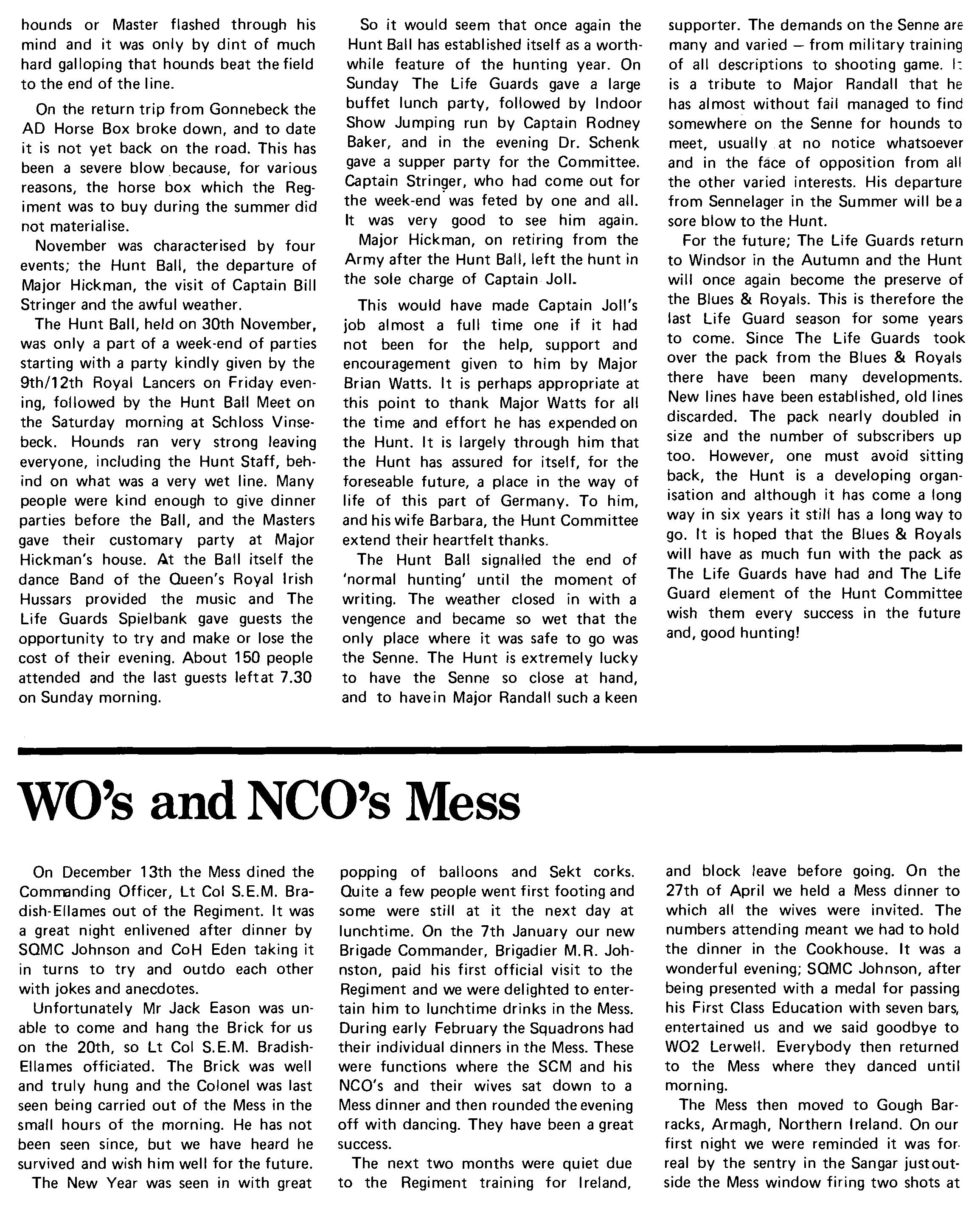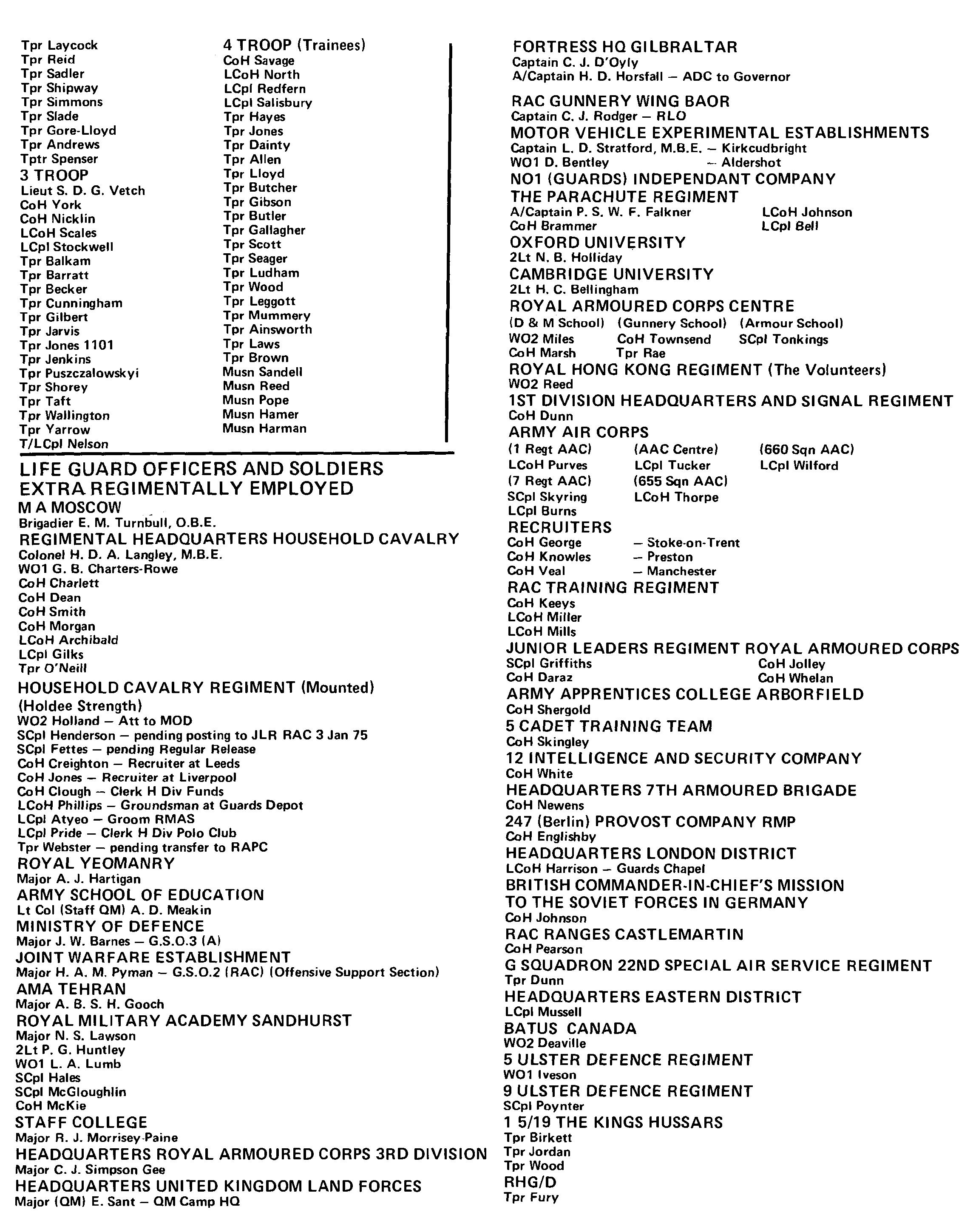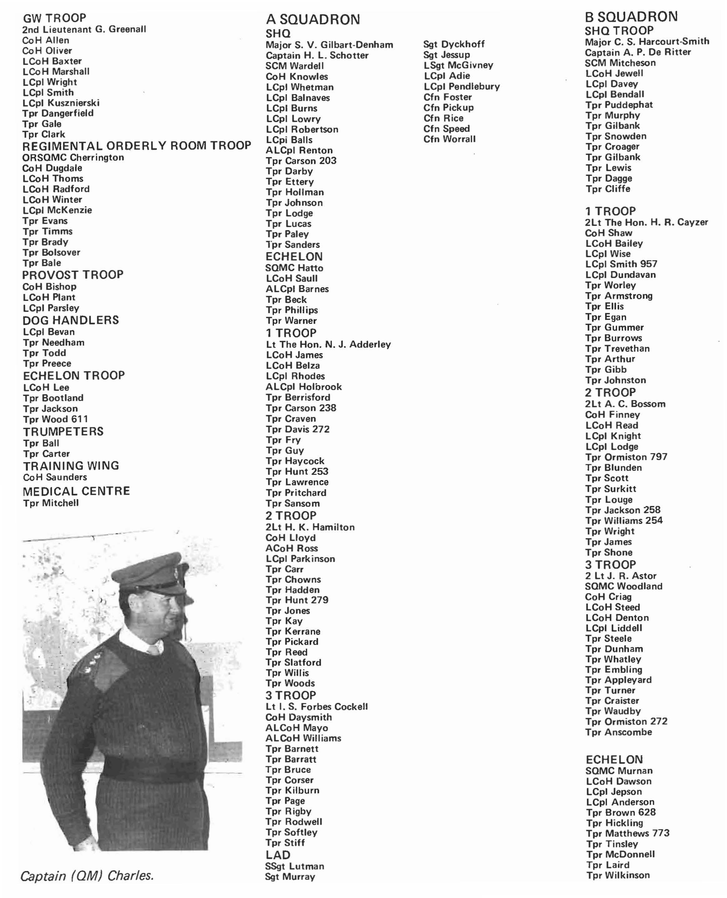 Along with the rest of the Regiment the Squadron has been subjected to many changes of role during the period covered by this magazine. Having started the year under the command of Captain Joll; when the Regiment re-organised for Ireland Captain Joll went to RHO as Public Relations Officer, Major Hickman took command of the Rear Party (half HO Squadron and half Command Squadron) with SCM Juleff as his SCM, and Major Boyt took command of those elements of the Squadron going to Northern Ireland who now called themselves RHO Squadron. SCM Batey had the fearsome task of keeping this motley throng in order. An article on the activities of the Squadron in Ireland appears later in this magazine and so it is necessary to ju mp forward in time to September when the Regiment re-organised. This time the Squadron line