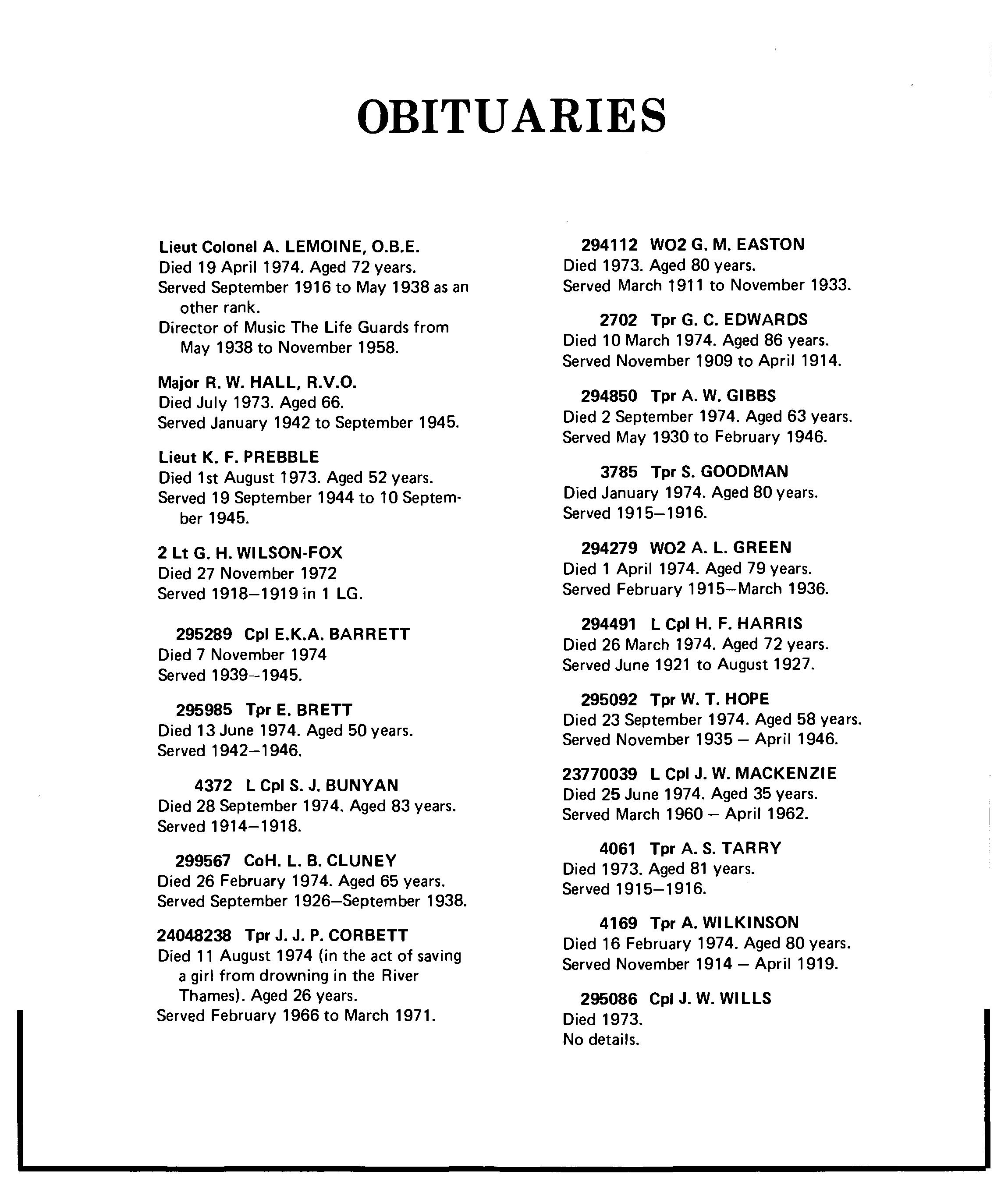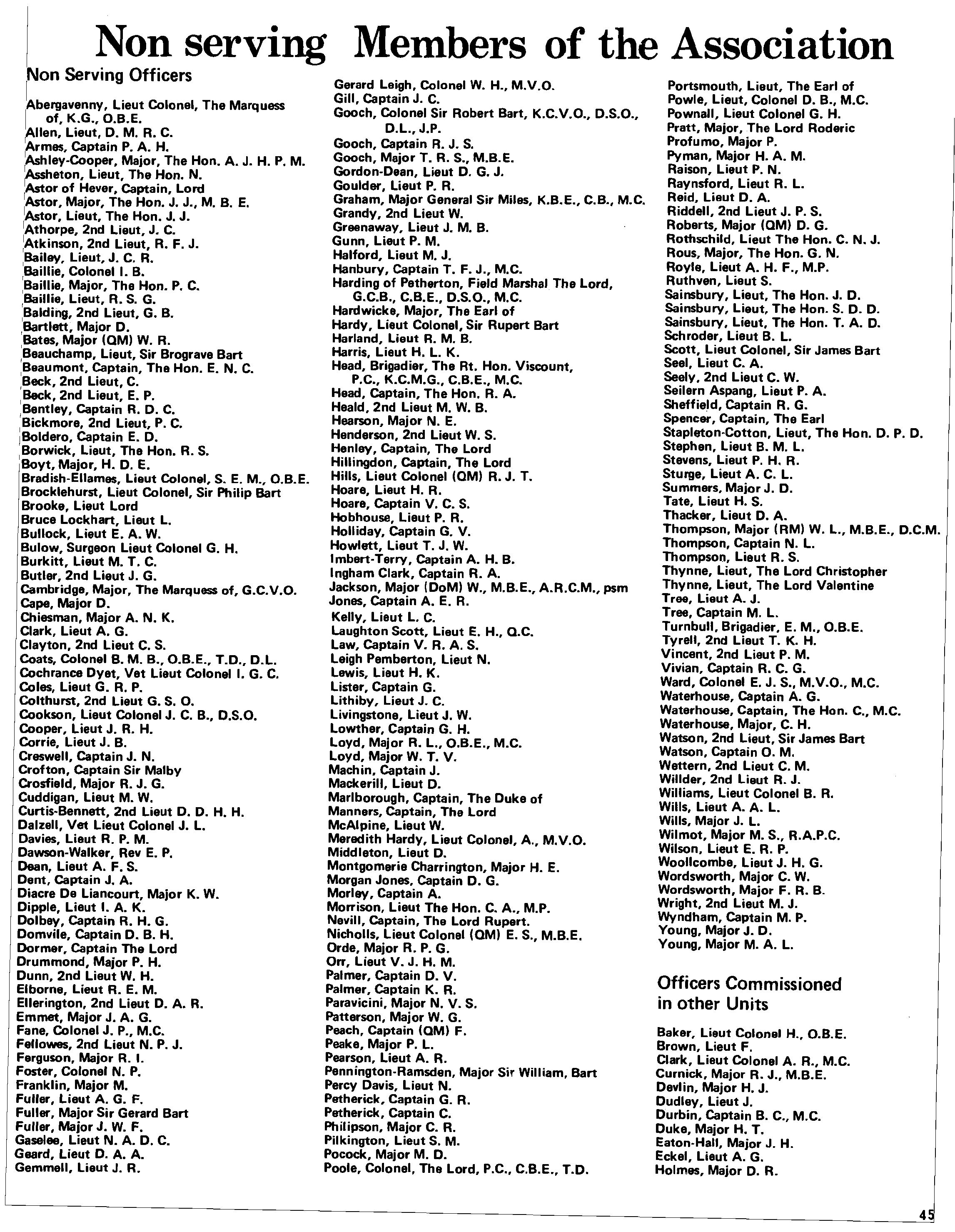 Portsmouth, Lieut, The Earl of Powle, Lieut, Colonel D. B., M.C. Pownall, Lieut Colonel G. H. Pratt, Major, The Lord Roderic Profumo, Major P. Pyman, Major H. A. M. Raison, Lieut P. N. Raynsford, Lieut R. L. Reid, Lieut D. A. Riddell, 2nd Lieut J. P. S. Roberts, Major 10M) D. G. Rothschild, Lieut The Hon. C. N. J. Rous, Major, The Hon. G. N. Royle, Lieut A. H. F., M.P. Ruthven, Lieut S. Sainsbury, Lieut, The Hon. J. D. Sainsbury, Lieut, The Hon. S. D. D. Sainsbury. Lieut. The Hon. T. A. D. Schroder, Lieut B. L. Scott, Lieut Colonel, Sir James Bart Seel, Lieut C. A. Seely. 2nd Lieut C. W. Seilern Aspang, Lieut P. A. Sheffield, Captain R. G. Spencer, Captain, The Earl Stapleton-Cotton, Lieut, The Hon. D. P. D. Stephen, Lieut B. M. L. Stevens, Lieut P. H. R. Sturge, Lieut A. C. L. Summers. Major J. D. Tate, Lieut H. S. Thacker, Lieut D. A. Thompson, Major (RM) W. L., M.B.E., D.C.M. Thompson, Captain N. L. Thompson, Lieut R. S. Thynne, Lieut, The Lord Christopher Thynne, Lieut, The Lord Valentine Tree, Lieut A. J. Tree, Captain M. L. Turnbull. Brigadier. E. M., O.B.E. Tyrell, 2nd Lieut T. K. H. Vincent, 2nd Lieut P. M. Vivian. Captain R. C. G. Ward, Colonel E. J. S., M.V.O., M.C. Waterhouse, Captain A. G. Waterhouse, Captain, The Hon. C., M.C. Waterhouse, Major, C. H. Watson, 2nd Lieut, Sir James Bart Watson, Captain O. M. Wettern, 2nd Lieut C. M. Willder,2nd Lieut R. J. Williams, Lieut Colonel B. R. Wills, Lieut A.A. L. Wills, Major J. L. Wilmot, Major M. S., R.A.P.C. Wilson. Lieut E. R. P. Woollcombe, Lieut J. H. G. Wordsworth, Major C. W. Wordsworth, Major F. R. B. Wright, 2nd Lieut M. J. Wyndham, Captain M. P. Young, Major J. D. Young, Major M. A. L.