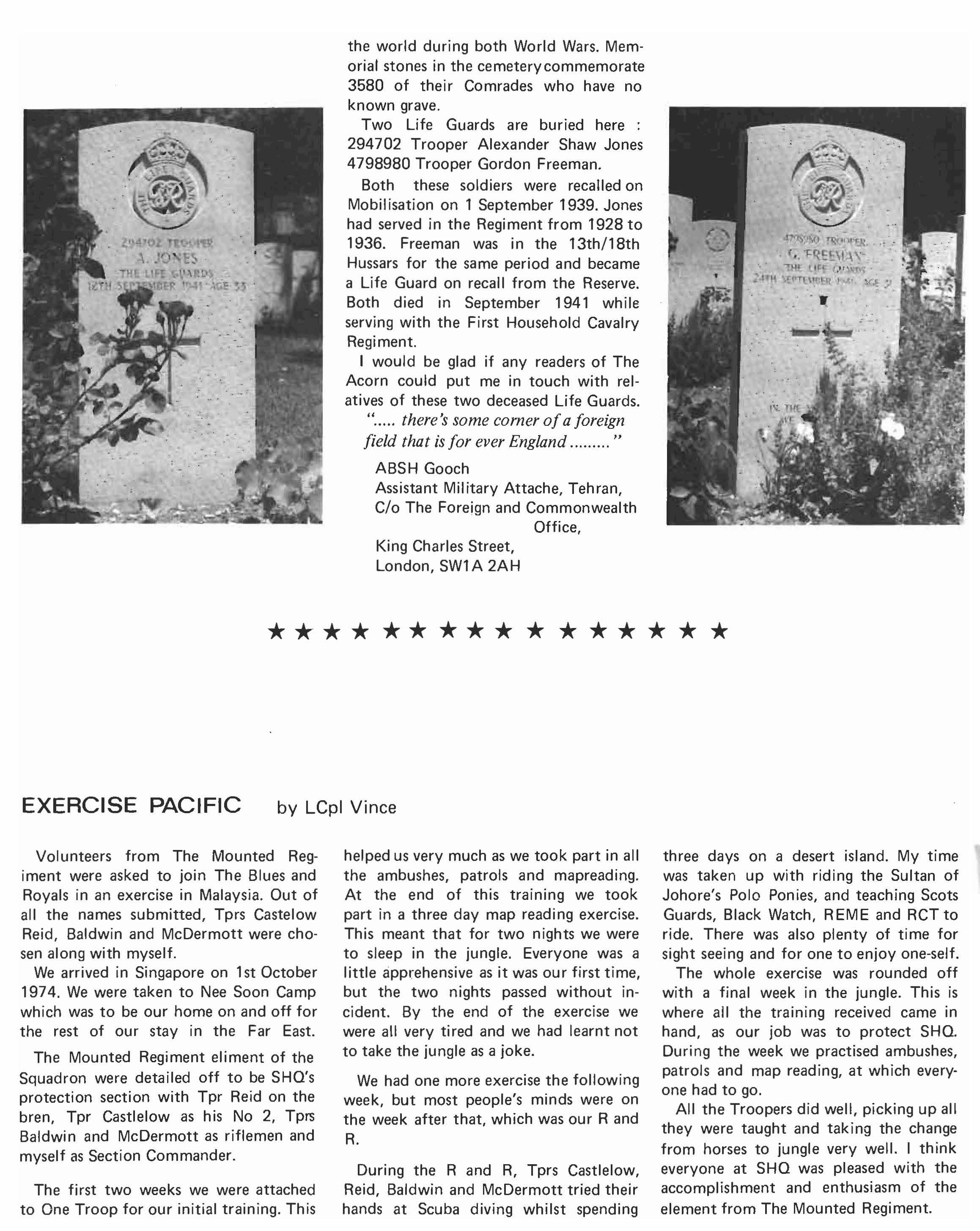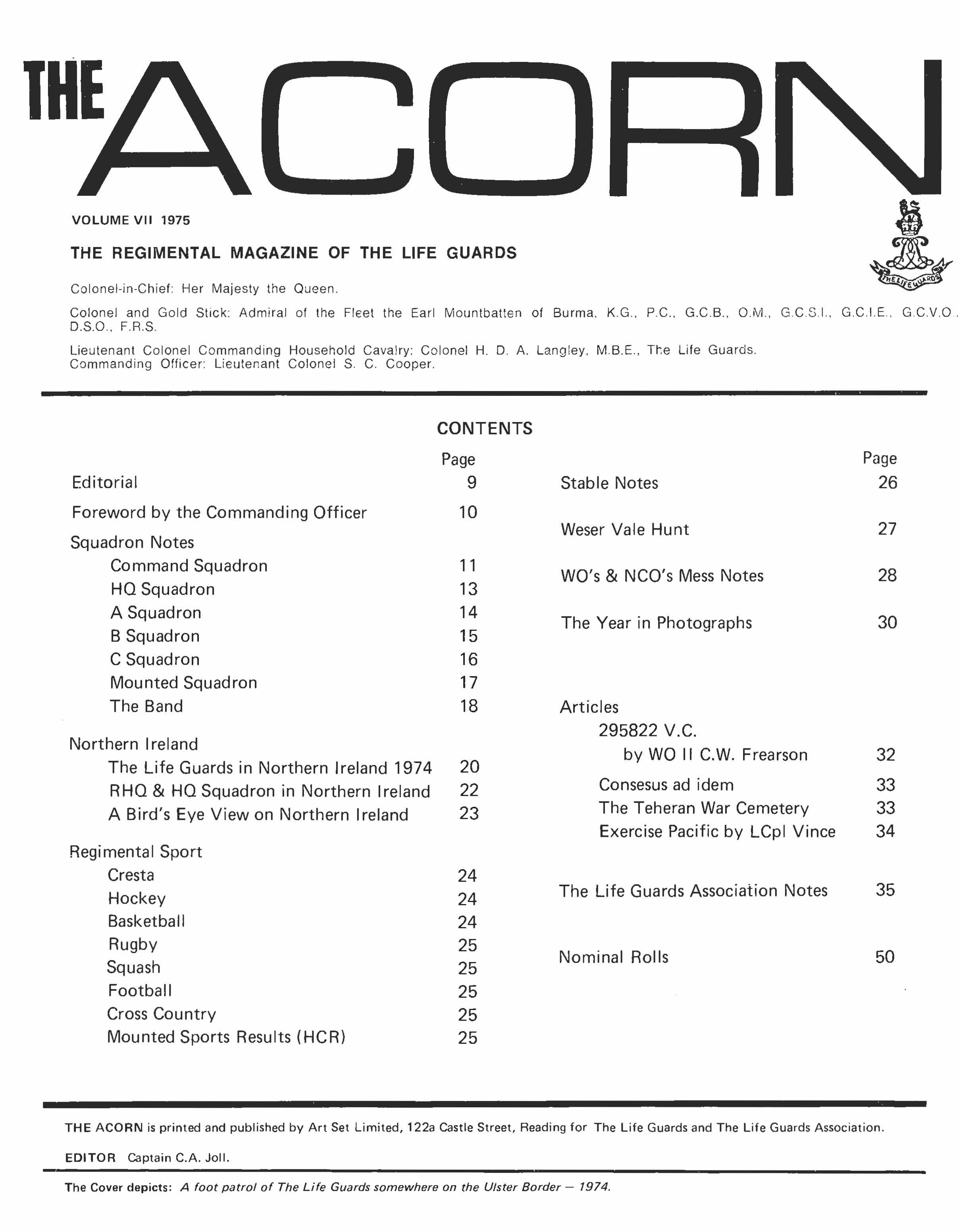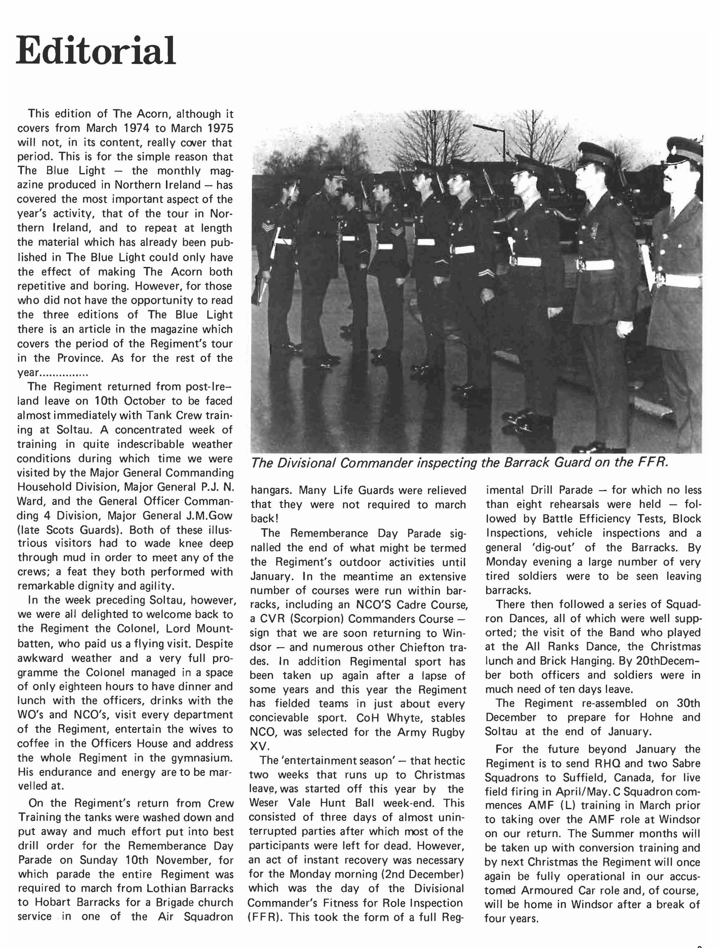 This edition of The Acorn, although it covers from March 1974 to March 1975 will not, in its content, really CCNer that period. This is for the simple reason that The Blue Light - the monthly magazine produced in Northern Ireland - has covered the most important aspect of the year's activity, that of the tour in Northern Ireland, and to repeat at length the material which has already been published in The Blue Light could only have the effect of making The Acorn both repetitive and boring. However, for those who did not have the opportunity to read the three editions of The Blue Light there is an article in the magazine which covers the period of the Regiment's tour in the Province. As for the rest of the year