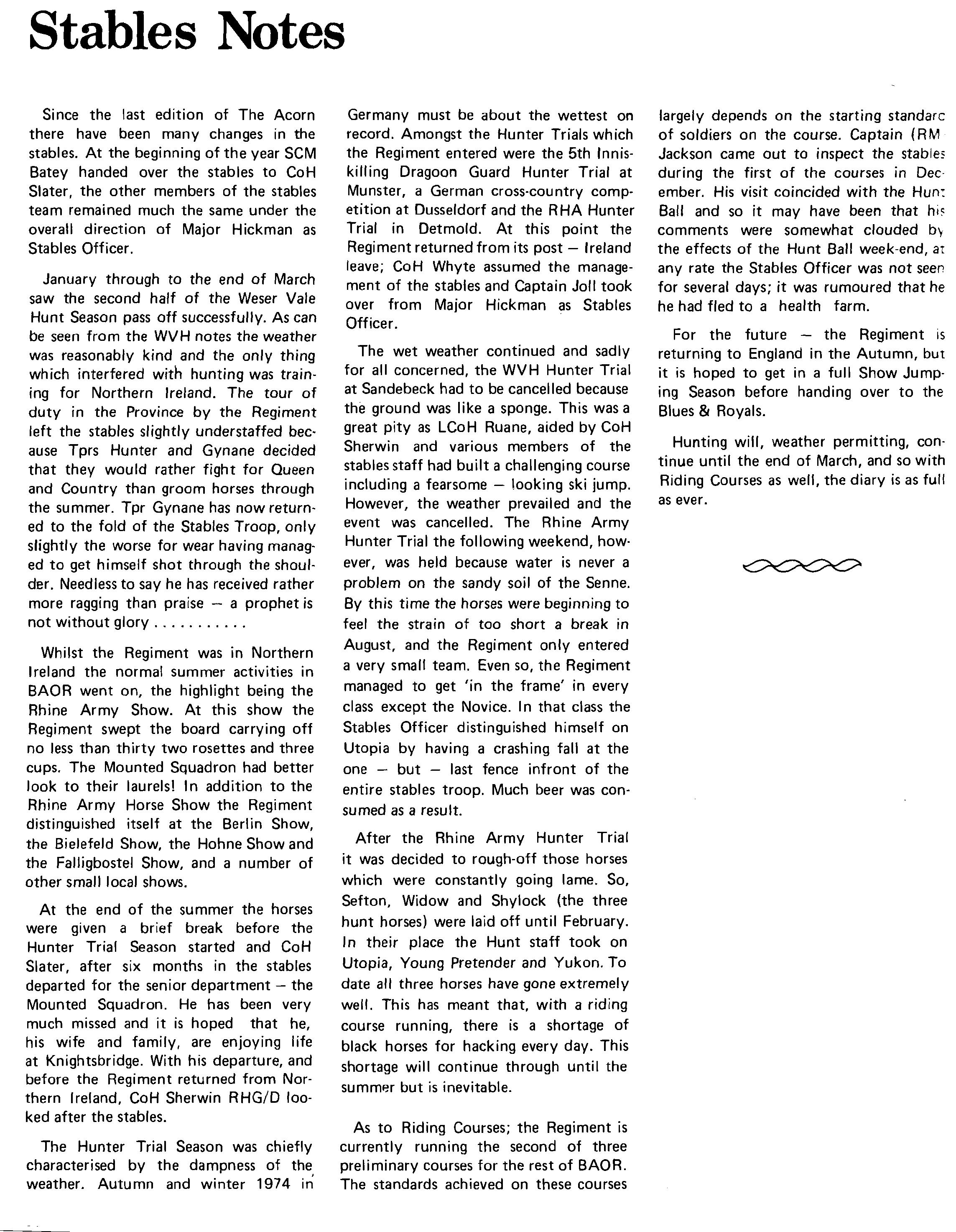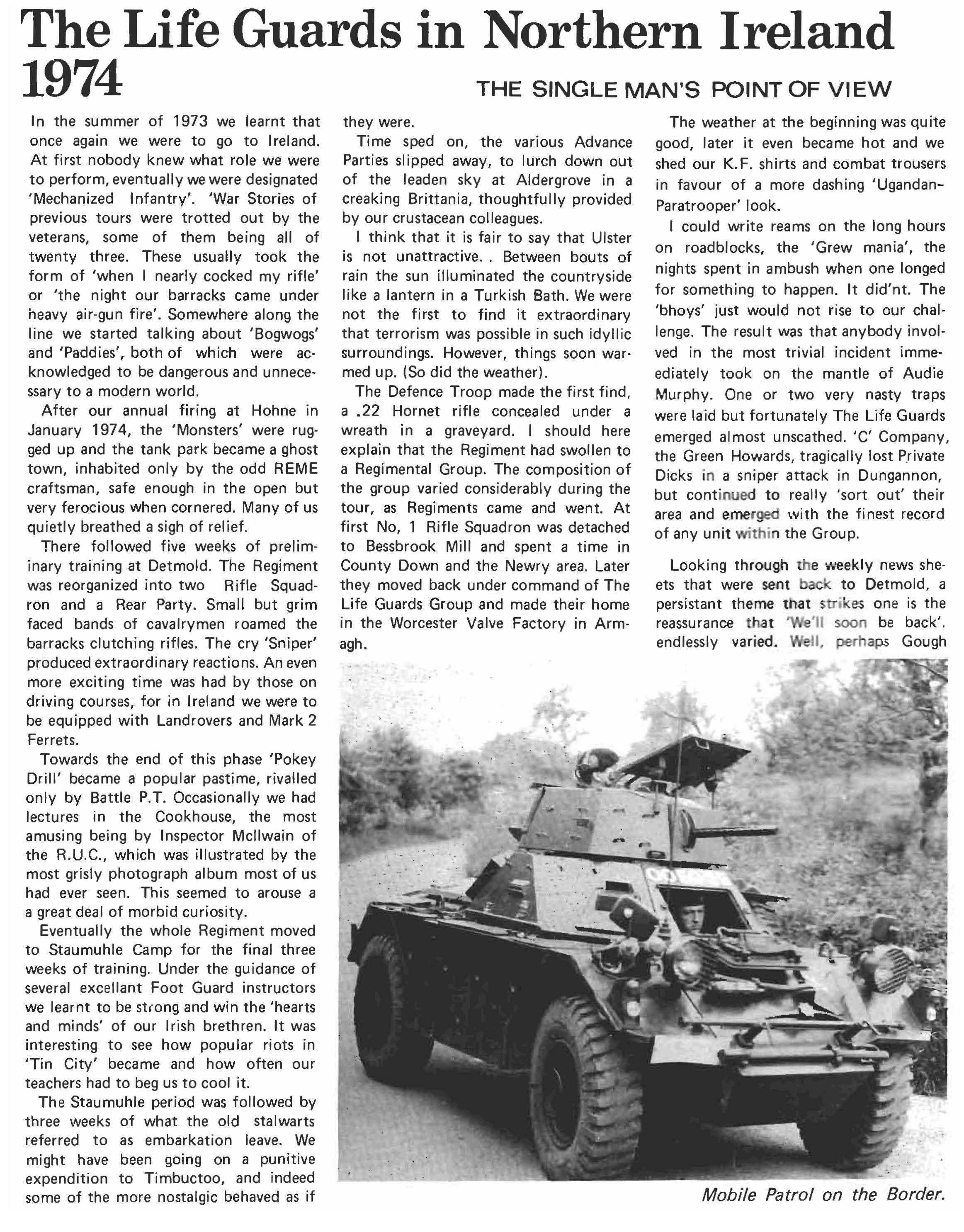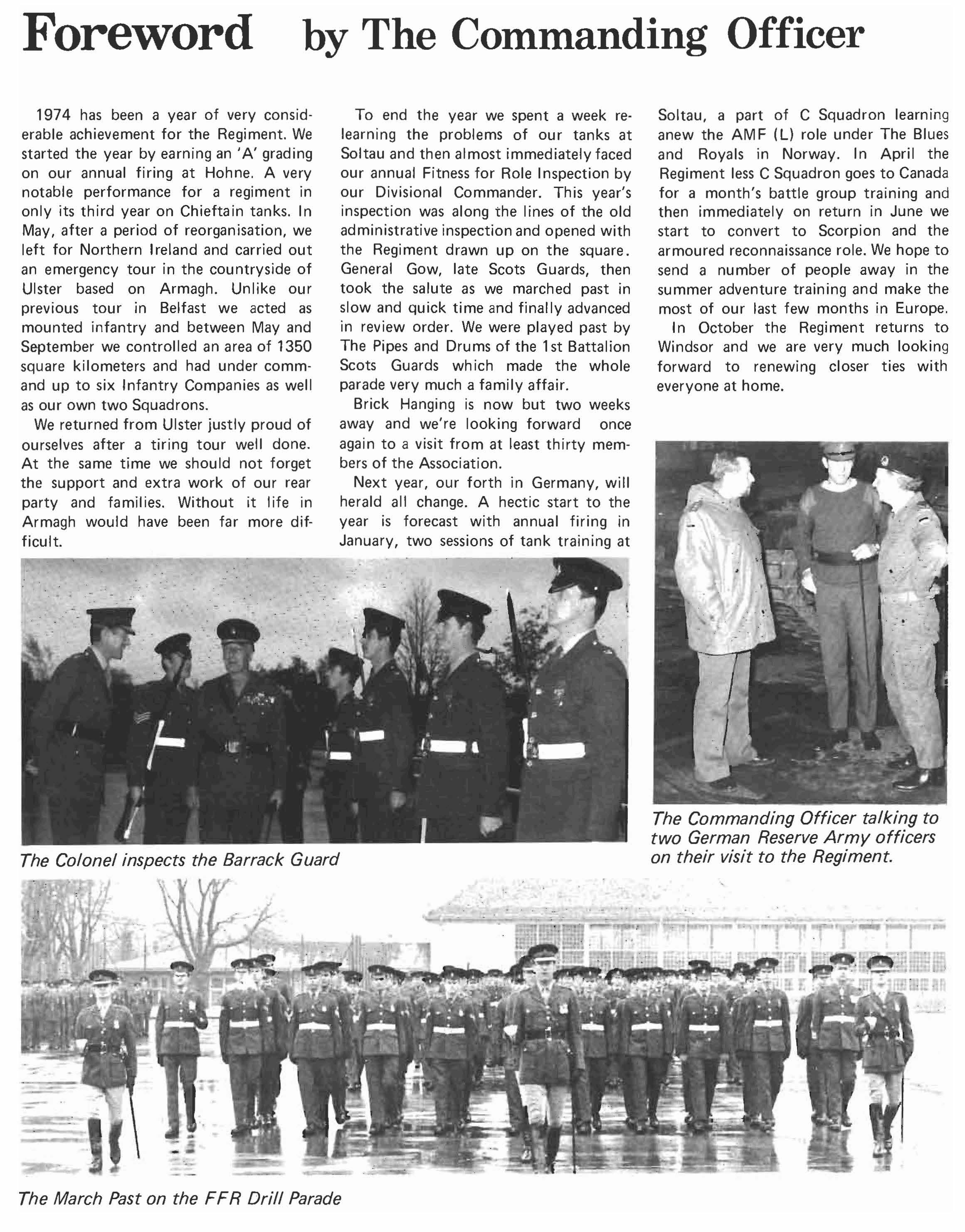 1974 has been a year of very considerable achievement for the Regiment. We started the year by earning an 'A' grading on our annual firing at Hohne. A very notable performance for a regiment in only its third year on Chieftain tanks. In May, after a period of reorgan isation, we left for Northern I reland and carried out an emergency tour in the countryside of Ulster based on Armagh. Unlike our previous tour in Belfast we acted as mounted infantry and between May and September we controlled an area of 1350 square kilometers and had under comm· and up to six Infantry Companies as well as our own two Squadrons. We returned from Ulster justly proud of ourselves after a tiring tour well done. At the same time we should not forget the support and extra work of our rear party and families. Without it life in Armagh would have been far more difficult.